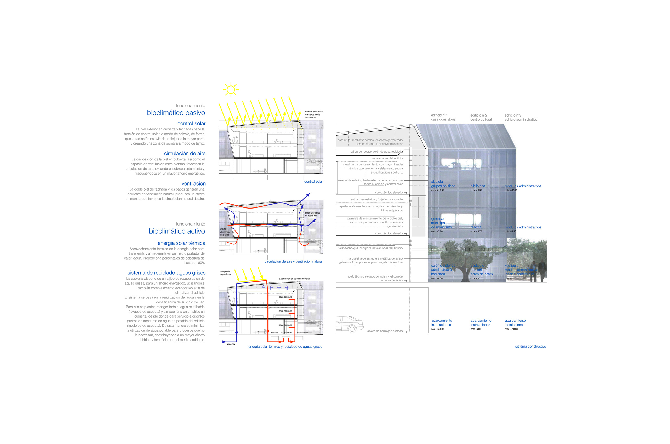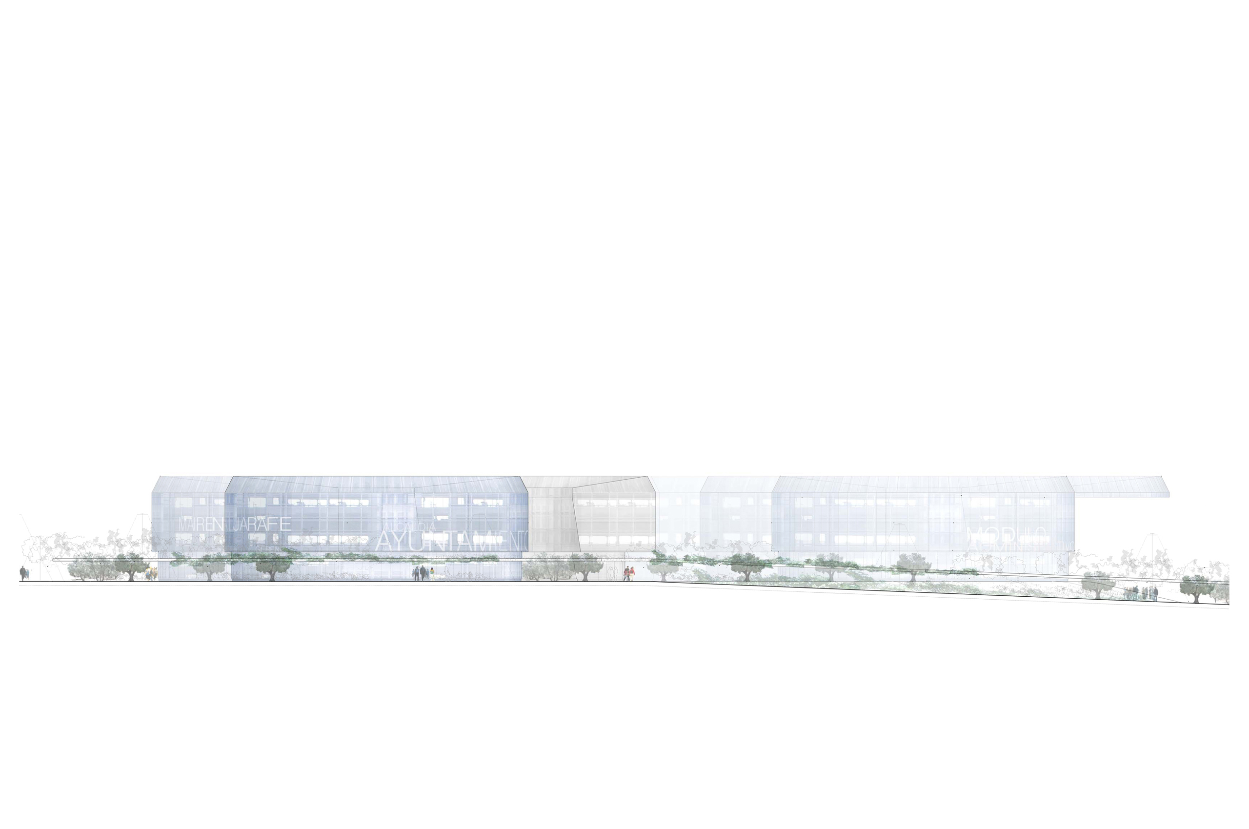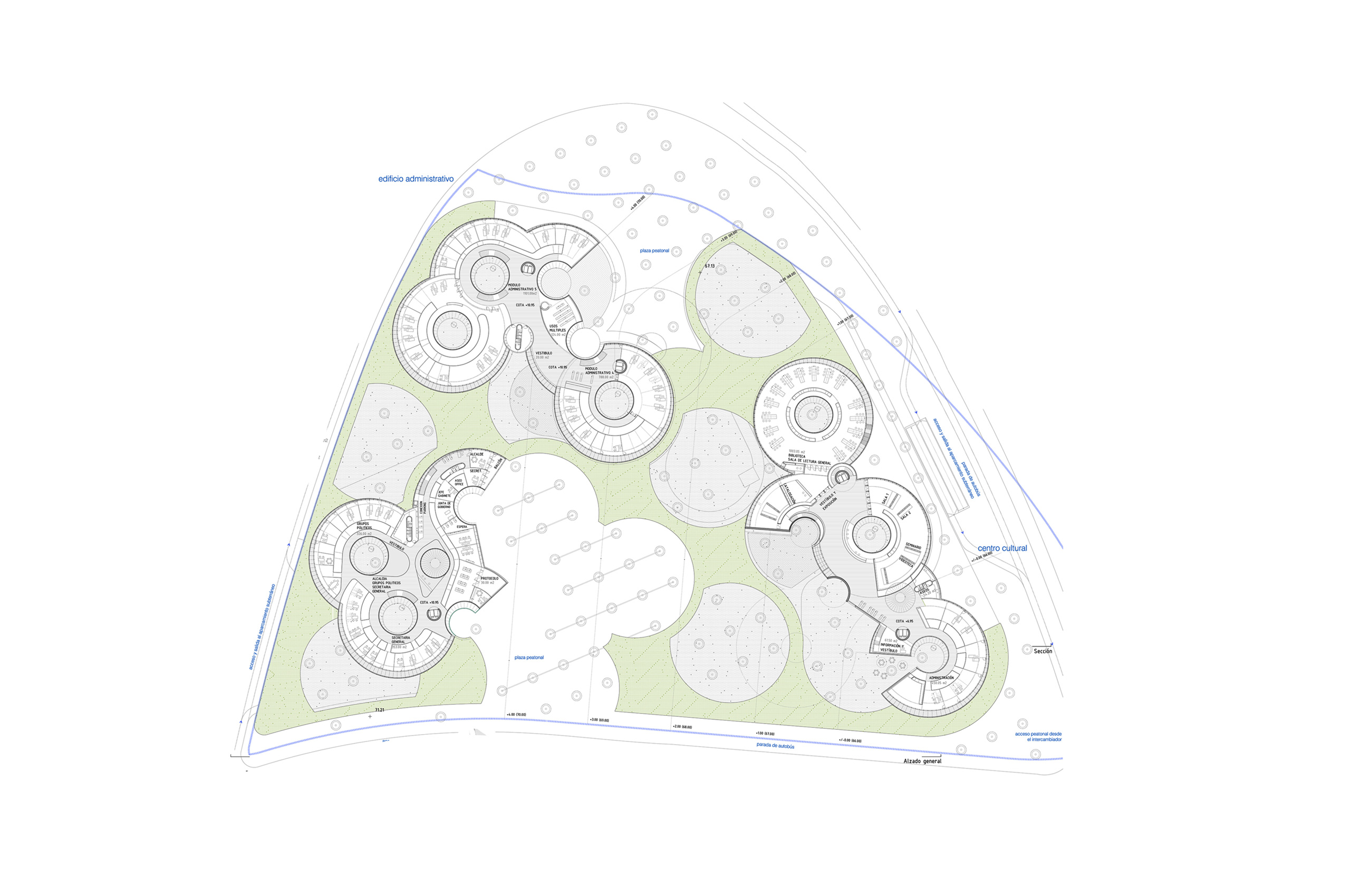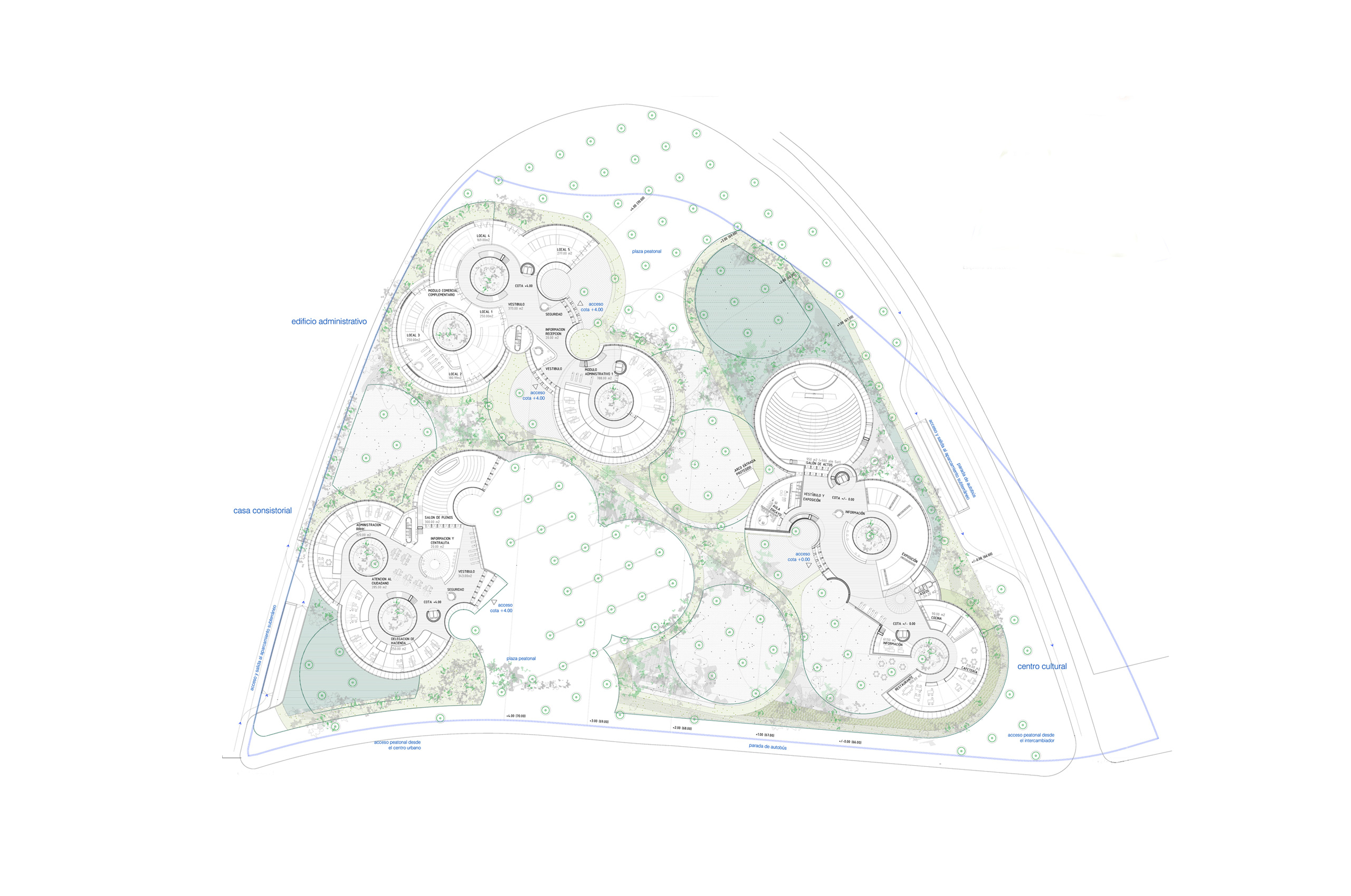 Disponemos en una trama uniforme y modulada dentro del ámbito del solar un conjunto de i-conos invertidos, y los agrupamos, atendiendo a los condicionantes de programa, estableciendo una distribución unitaria de toda la actuación pero con flexibilidad en cada uno de los usos, con el carácter representativo específico que cada programa requiere. El cerramiento de las diferentes piezas se retranquea haciendo que parte de éstos funcionen como grandes cubriciones exteriores, generando bajo ellas agradables espacios en sombra. Además producimos un plano vegetal a 2,40 metros de altura que enlaza las diferentes piezas (casa consistorial, centro cultural y edificio administrativo) permitiendo así una cómoda conexión peatonal entre ellas.