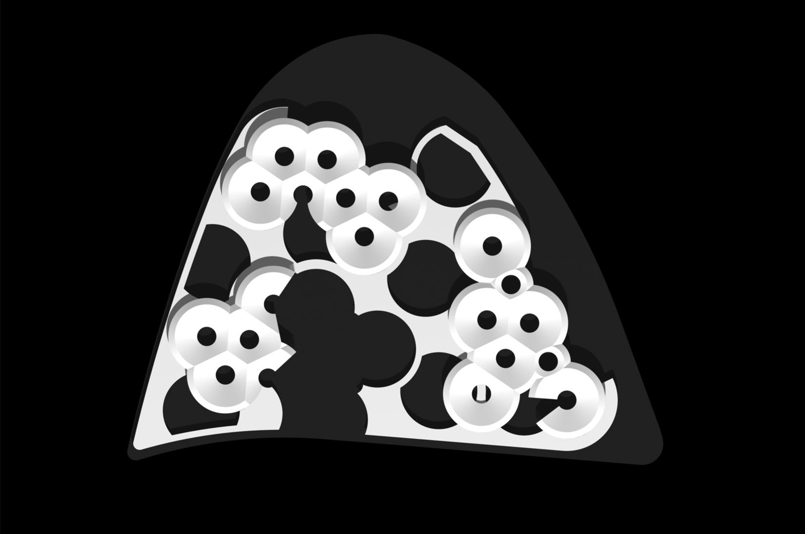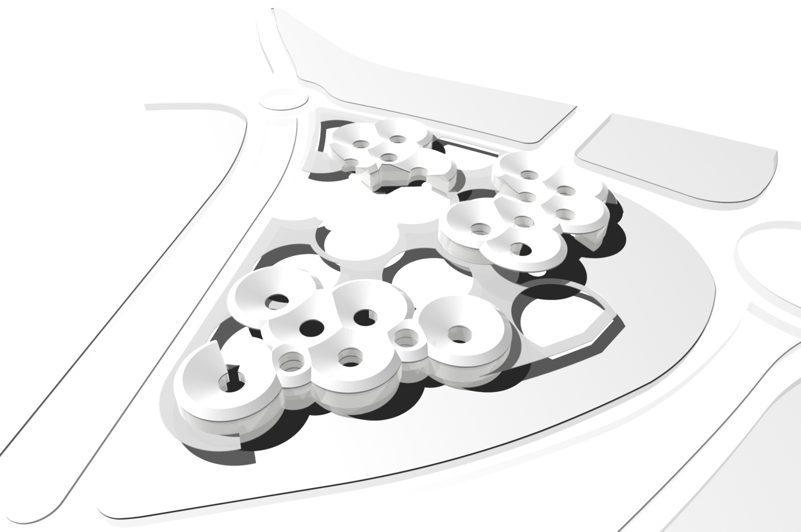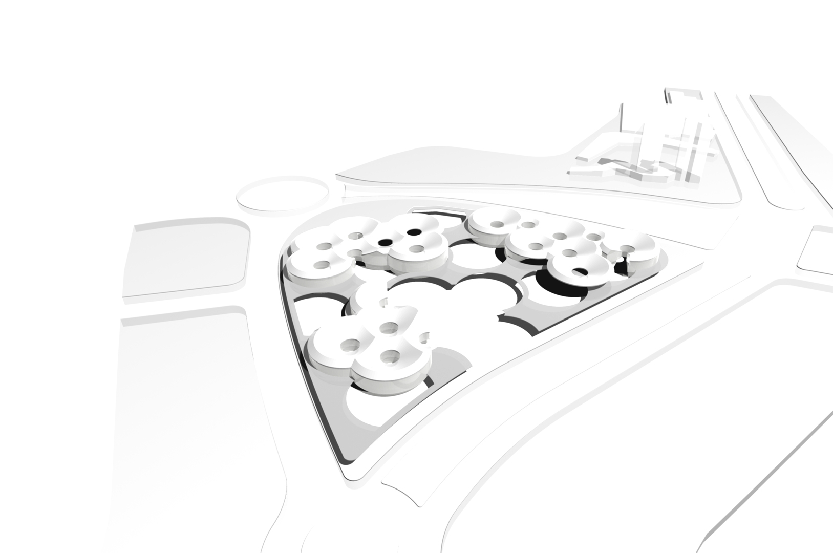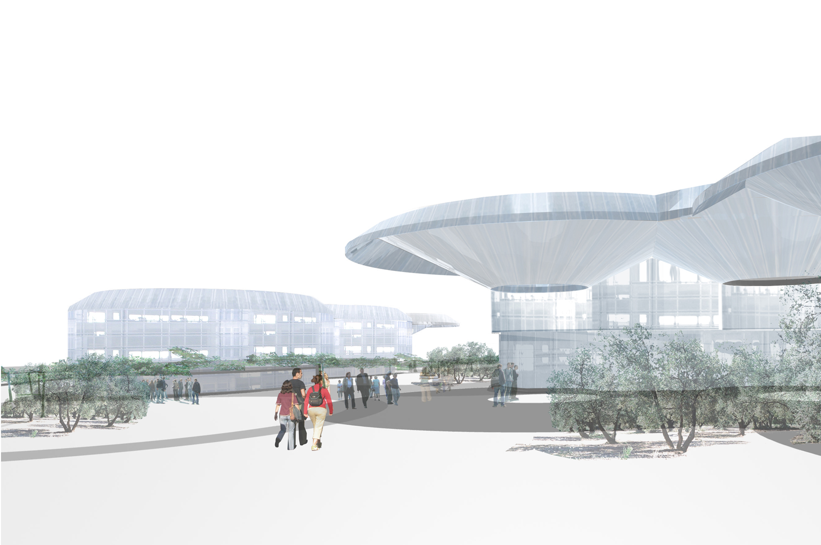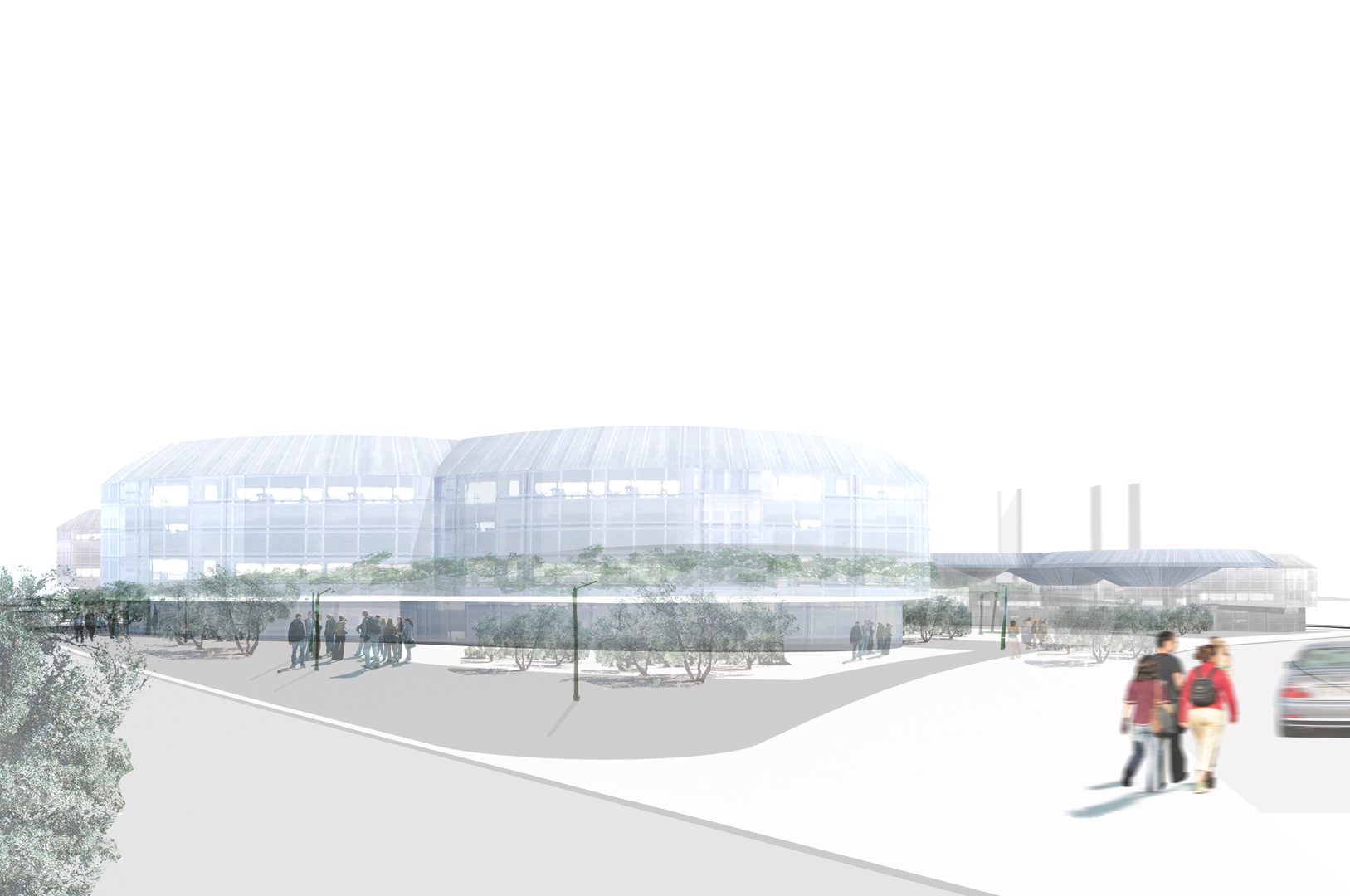 Disponemos en una trama uniforme y modulada dentro del ámbito del solar un conjunto de i-conos invertidos, y los agrupamos, atendiendo a los condicionantes de programa, estableciendo una distribución unitaria de toda la actuación pero con flexibilidad en cada uno de los usos, con el carácter representativo específico que cada programa requiere. El cerramiento de las diferentes piezas se retranquea haciendo que parte de éstos funcionen como grandes cubriciones exteriores, generando bajo ellas agradables espacios en sombra. Además producimos un plano vegetal a 2,40 metros de altura que enlaza las diferentes piezas (casa consistorial, centro cultural y edificio administrativo) permitiendo así una cómoda conexión peatonal entre ellas.