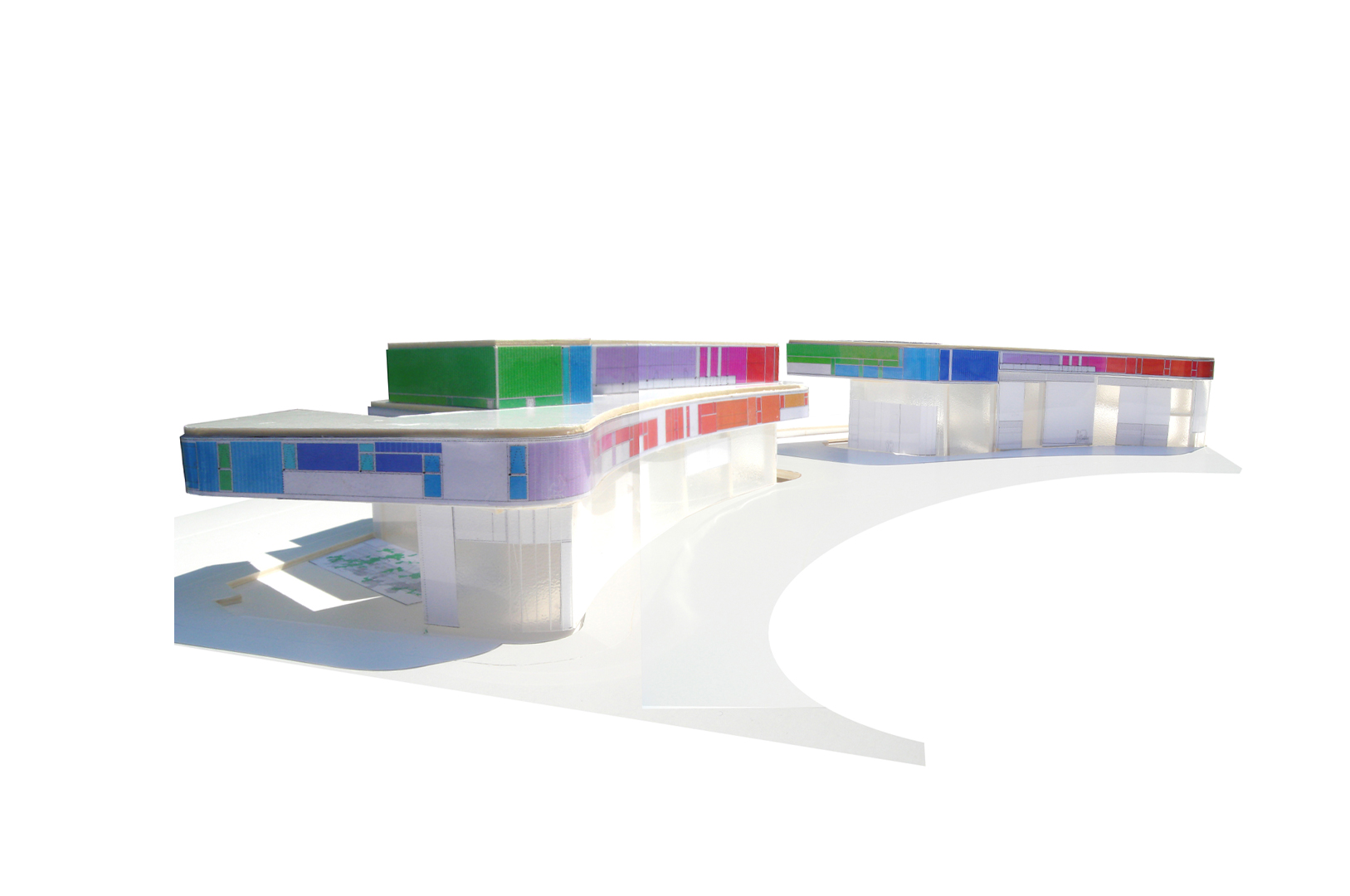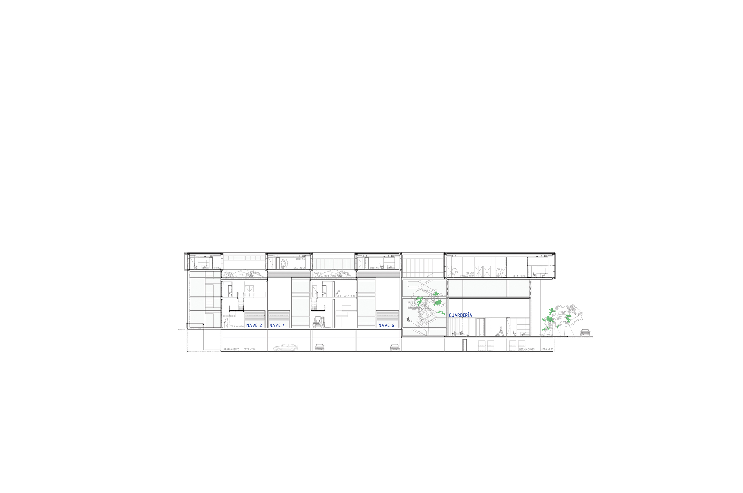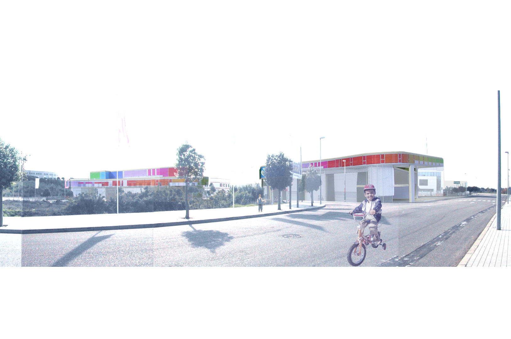 El tejido en el que se dispondrán los Centros tiene una importante densidad acorde a los usos que en él se disponen y aunque se sitúan en uno de los límites del polígono, entendemos que uno de los objetivos a la hora de desarrollar este proyecto debe ser facilitar el rápido reconocimiento de los ciudadanos que accedan a éstos centros, así como generar una imagen identificable. Para conseguir esto, planteamos que ésta imagen sea producida por la propia expresión formal de las oficinas y locales, de modo que, dada su disposición elevada, se entiendan como cintas de color perceptibles desde múltiples lugares.
