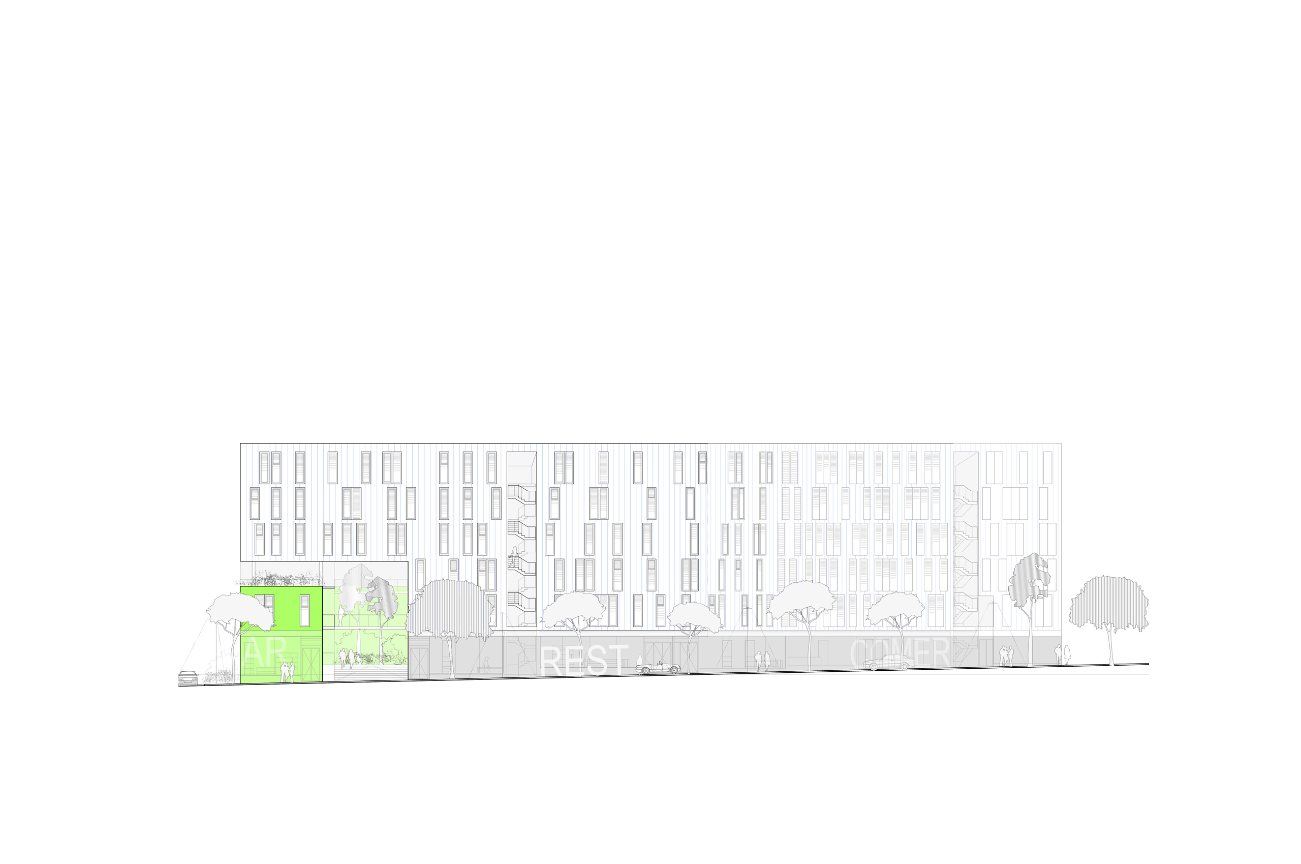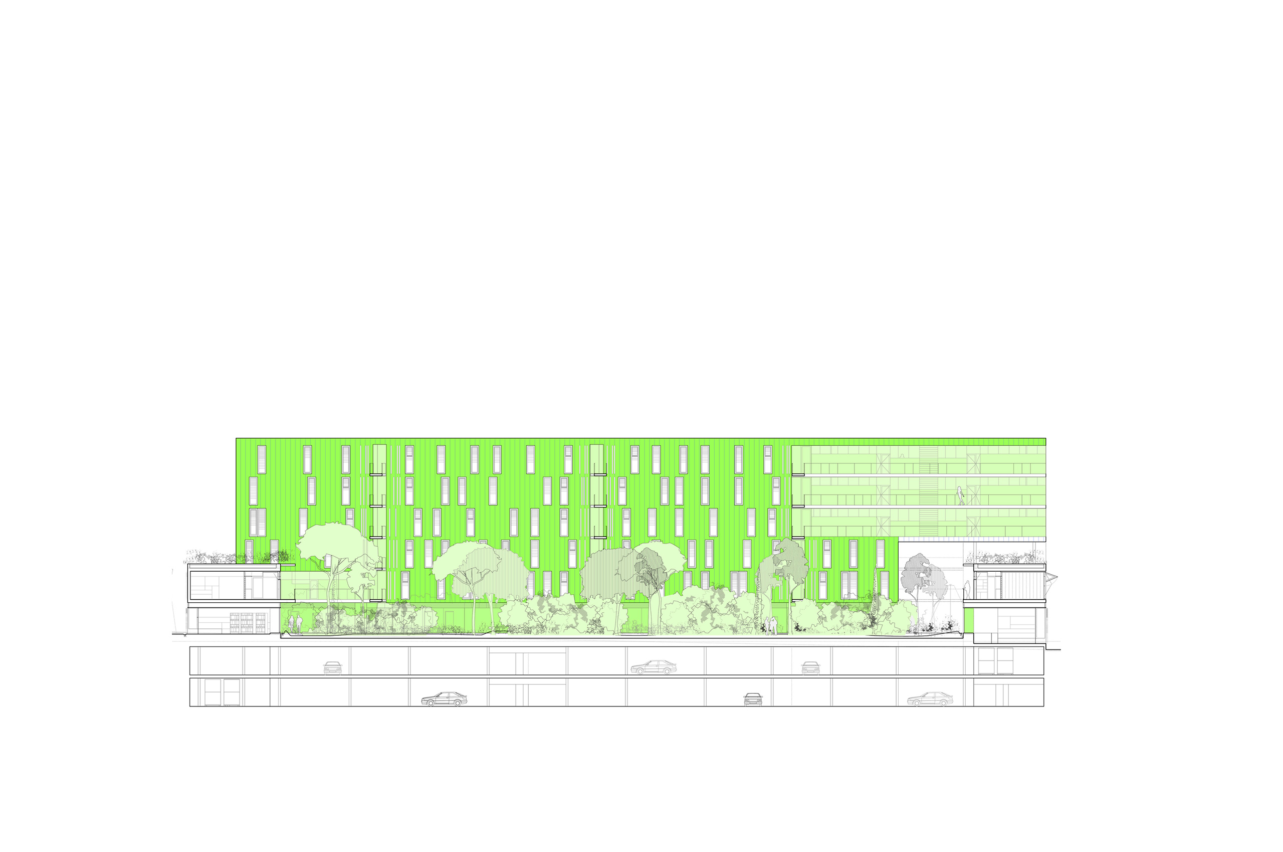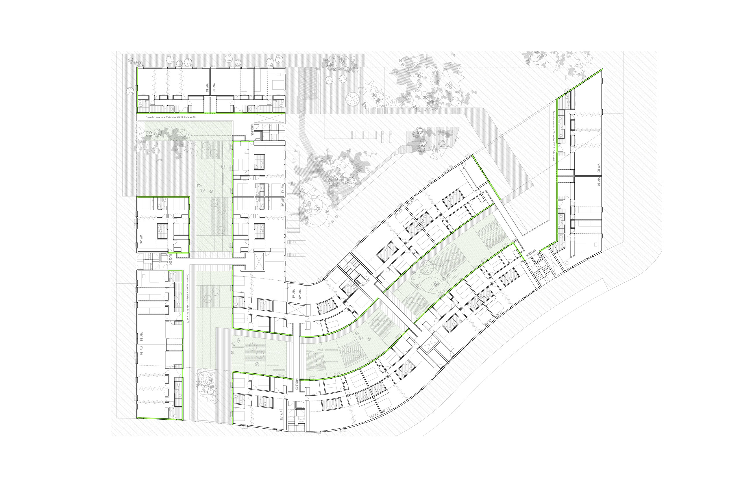 Descomponemos el volumen capaz planteado por el estudio de detalle en 3 cuerpos de crujía 7,9 metros, que se vacían en los puntos de encuentro entre ellos. La disposición de estos cuerpos viene determinada por el cumplimiento del área establecida por el fondo edificable máximo así como de las alineaciones obligatorias que permite el estudio de detalle. Esta disposición genera entre los volúmenes una calle interior, abierta en sus extremos y con aberturas en cada encuentro de los volúmenes, cuyas características de iluminación, ventilación, calidad espacial y flexibilidad la hacen deseable frente a una sucesión de pequeños patios interiores. La calle interior se convierte en un gran jardín, cuyas características de iluminación, ventilación, temperatura, humedad y vegetación producen un espacio fresco en verano y atemperado en invierno, funcionando a modo de colchón climático para las viviendas.
