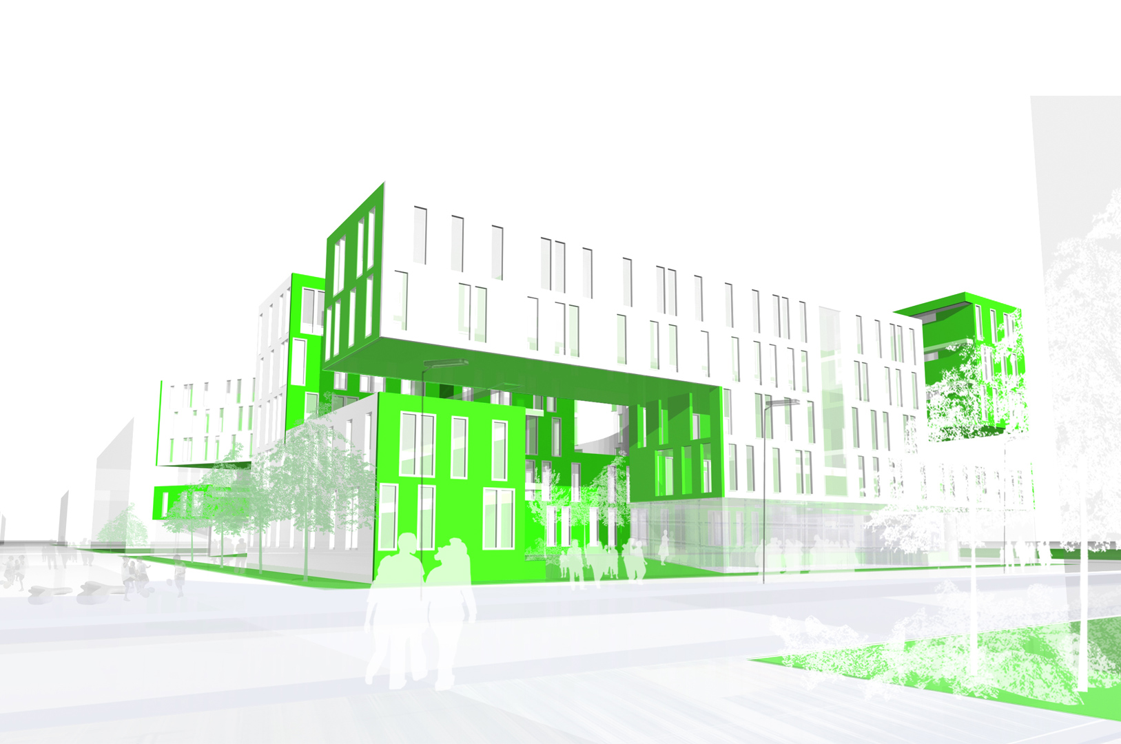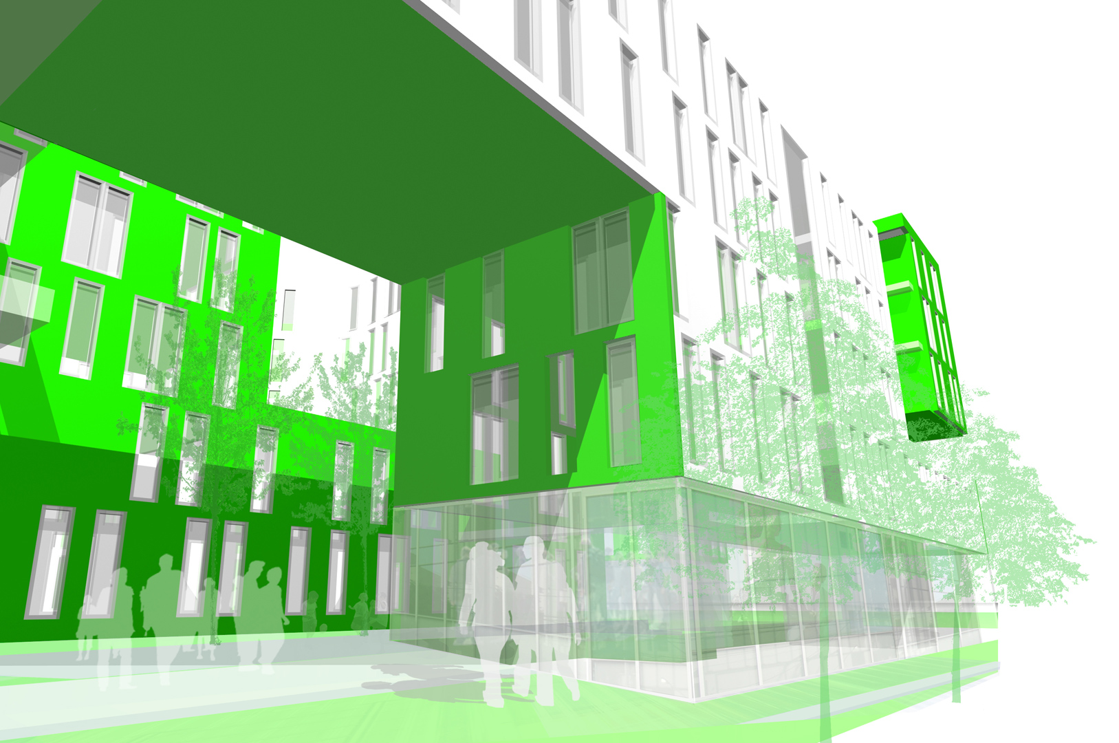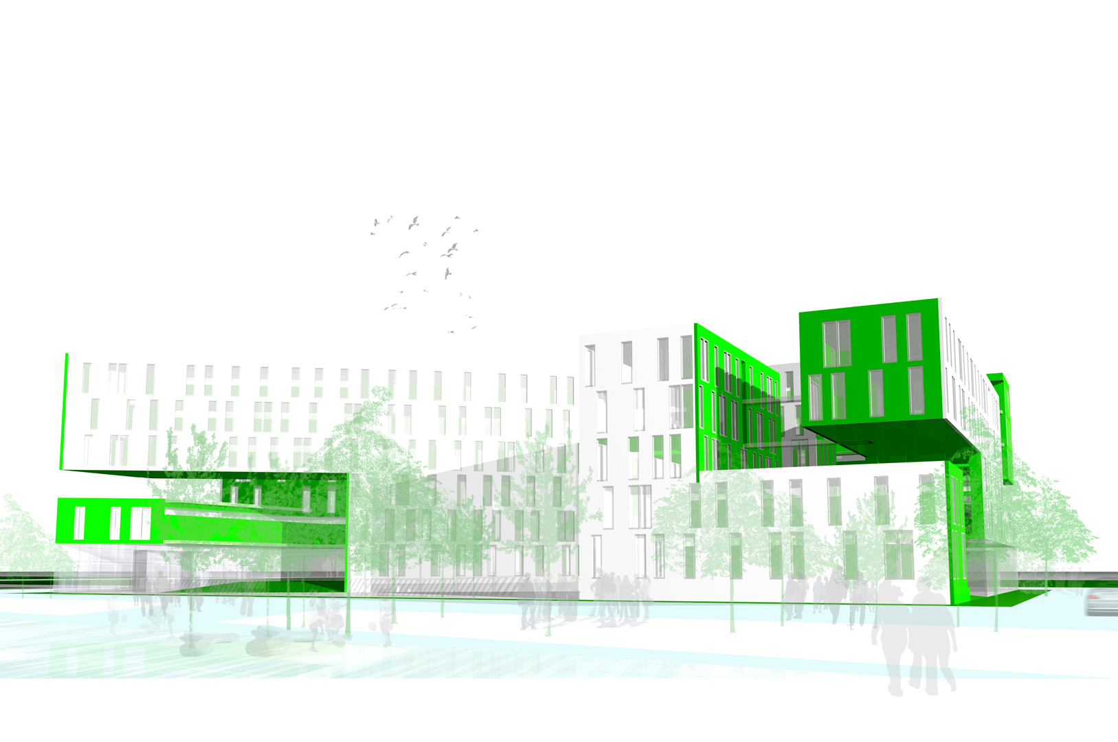 Descomponemos el volumen capaz planteado por el estudio de detalle en 3 cuerpos de crujía 7,9 metros, que se vacían en los puntos de encuentro entre ellos. La disposición de estos cuerpos viene determinada por el cumplimiento del área establecida por el fondo edificable máximo así como de las alineaciones obligatorias que permite el estudio de detalle. Esta disposición genera entre los volúmenes una calle interior, abierta en sus extremos y con aberturas en cada encuentro de los volúmenes, cuyas características de iluminación, ventilación, calidad espacial y flexibilidad la hacen deseable frente a una sucesión de pequeños patios interiores. La calle interior se convierte en un gran jardín, cuyas características de iluminación, ventilación, temperatura, humedad y vegetación producen un espacio fresco en verano y atemperado en invierno, funcionando a modo de colchón climático para las viviendas.