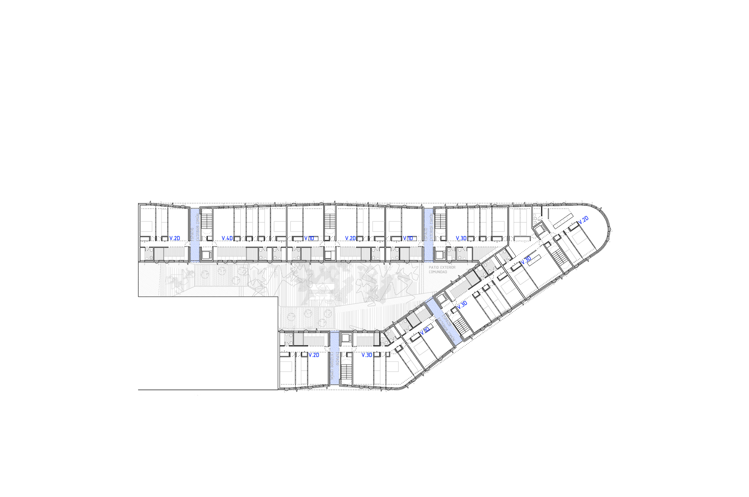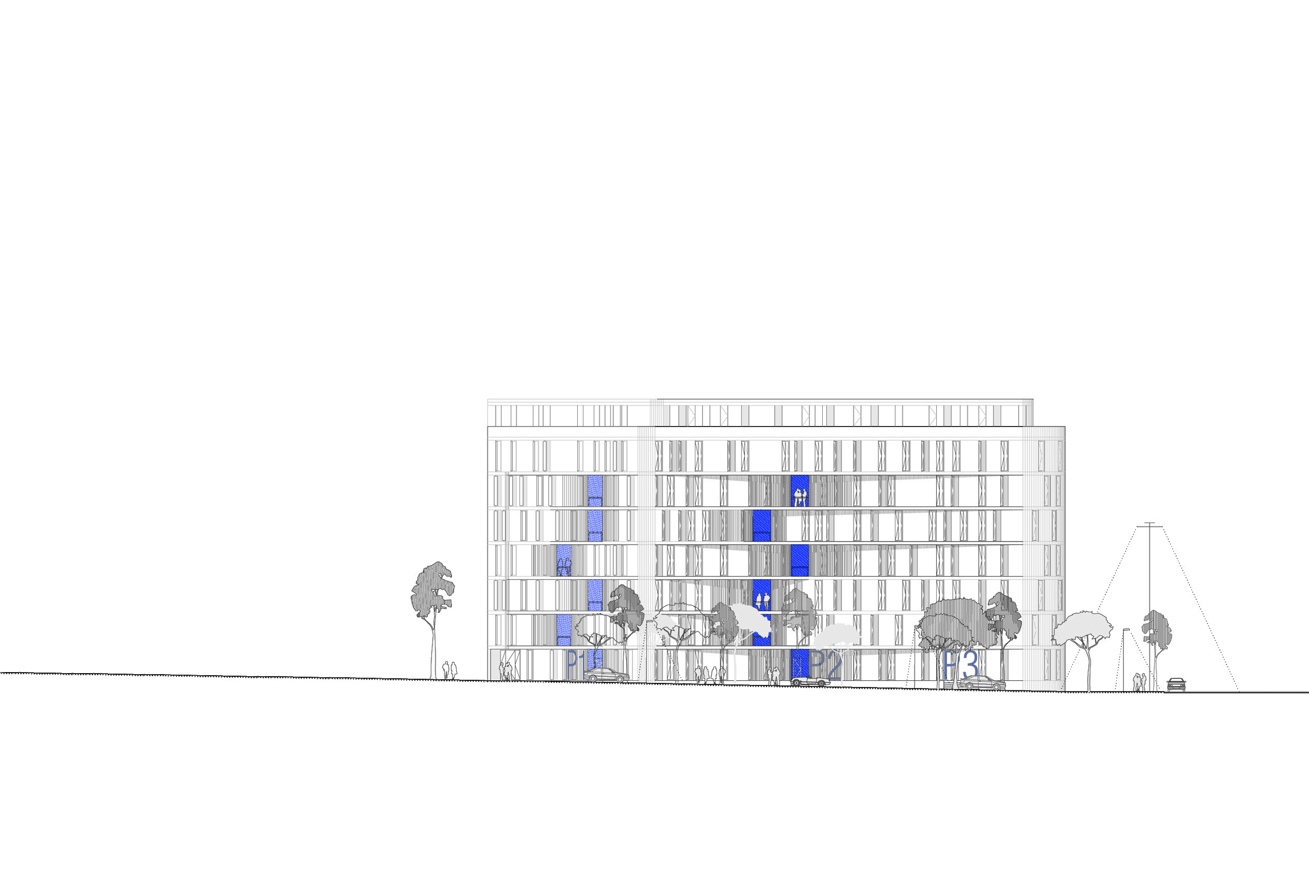 Proponemos una tipología de vivienda pasante con una crujía óptima que valore el espacio exterior común. Una cinta exterior acoge los espacios de estar y dormitorios con una piel cambiante, y una cinta interior corrida agrupa todos los espacios servidores con iluminación y ventilación directas. Las unidades de vivienda se generan mediante un sistema abierto y versátil que permite incluir las variedades tipológicas que exige el programa dentro de un soporte estable. Se disponen las diferentes tipologías generadas dando origen a los espacios exteriores comunes de cada planta, las perforaciones que vacían el bloque. Se consigue así el número de viviendas exigido dentro de una lámina plegada, vibrante y horadada.
