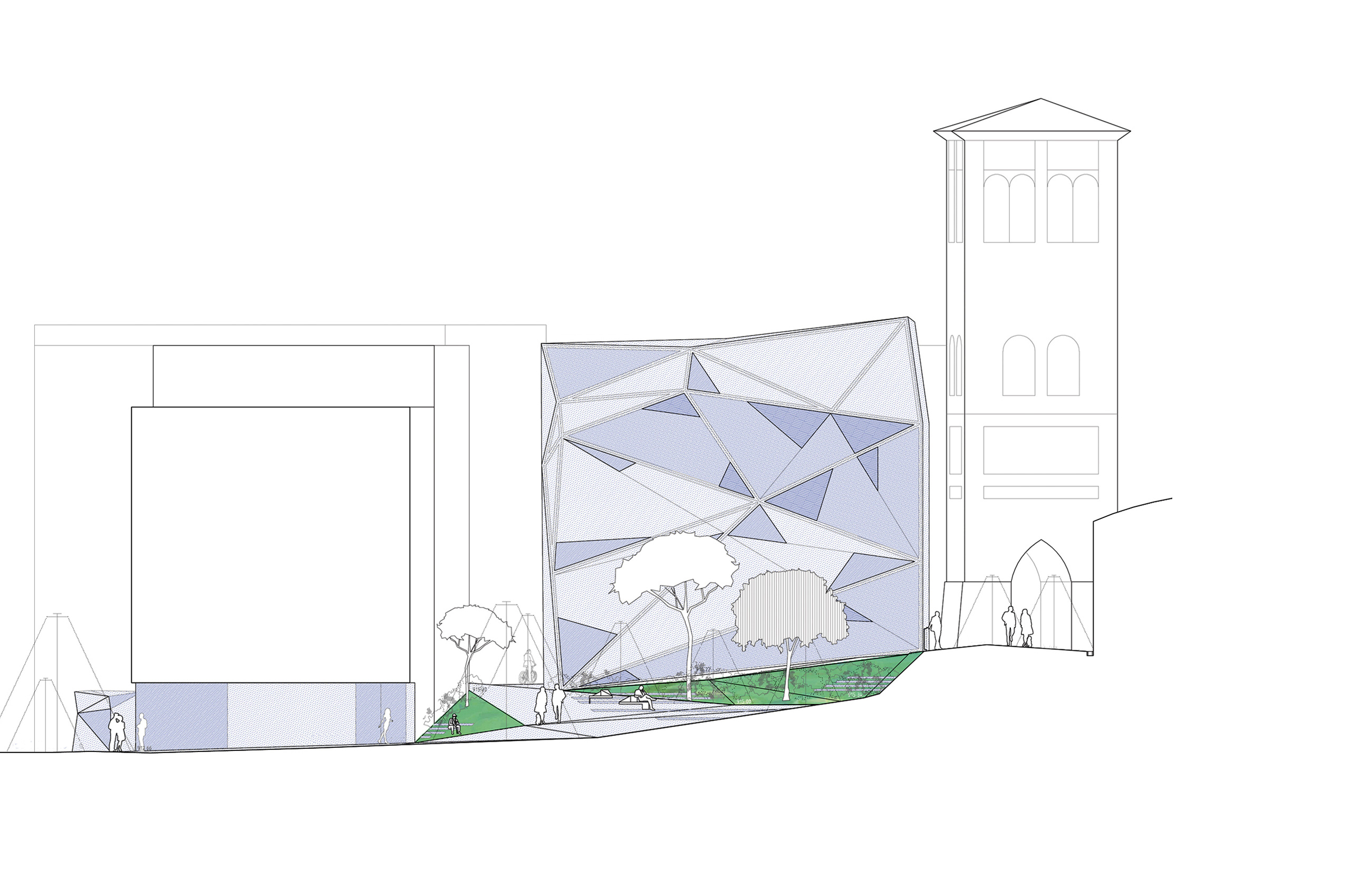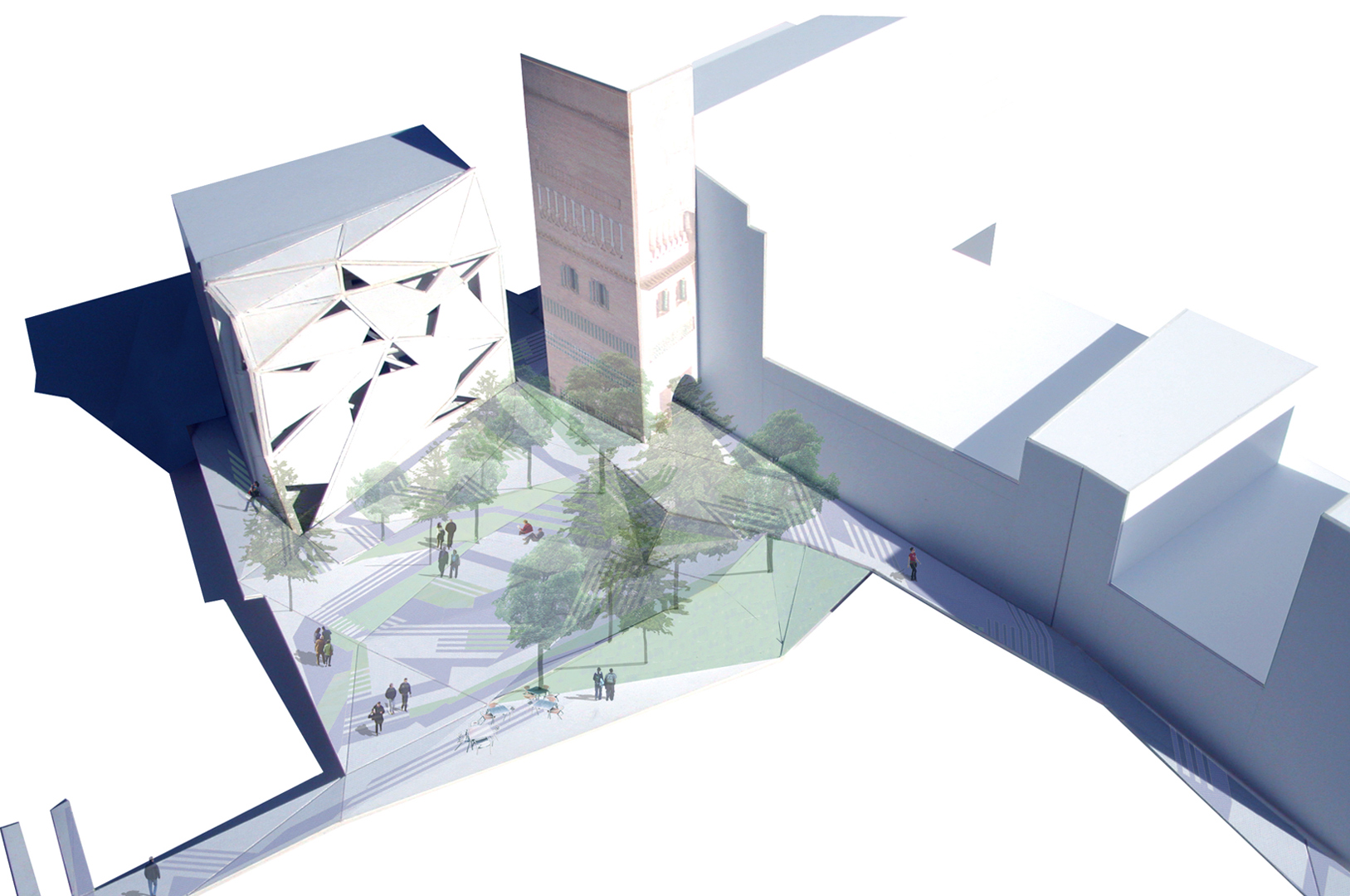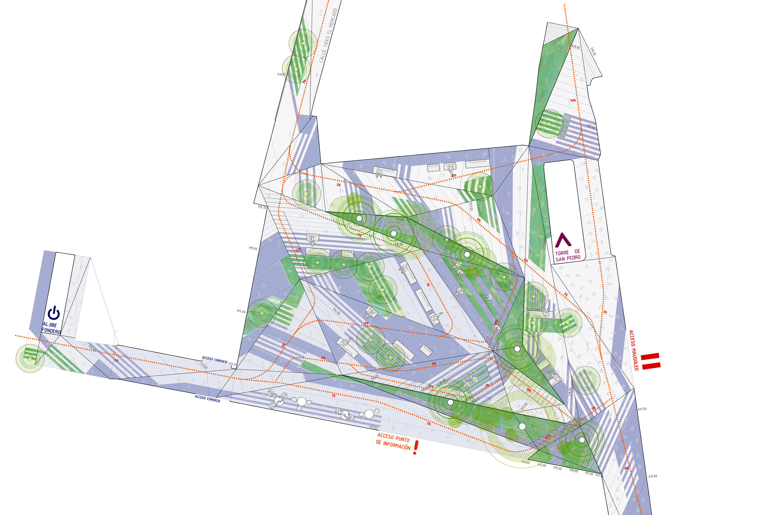 La plaza de los amantes, hoy en día, se encuentra diferenciada a su vez en varias plazas en diferentes cotas, conectadas entre sí por un complicado sistema de escaleras. La primera operación que realizamos es generar un único plano que conecta las diferentes cotas de su perímetro mediante un sistema de plegaduras que producen una suma de planos triangulares cuyas pendientes se establecen en función de los usos y recorridos que se desarrollan en la plaza. La continuidad entre los diferentes planos triangulares la determina la diferencia de pendiente entre ellos, produciéndose así una trama de circulaciones compatible con espacios más estáticos. El análisis de diversos condicionantes (continuidad, recogida de aguas, circulaciones, pendientes...) desemboca en una topografía cambiante que es capaz de resolver las diferencias de cota de los accesos a los diferentes focos de interés de la plaza sin romper su continuidad perceptiva y funcional.