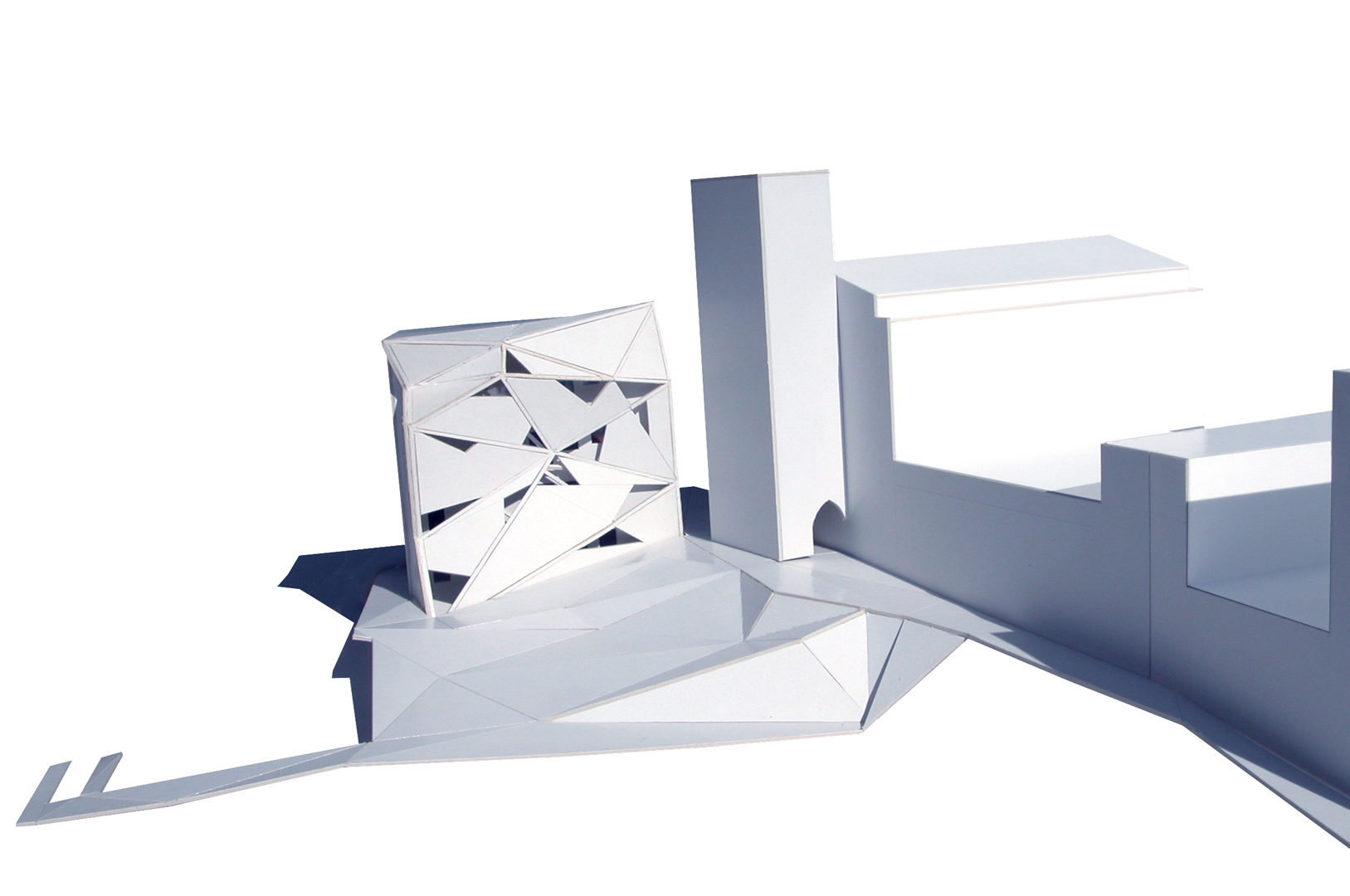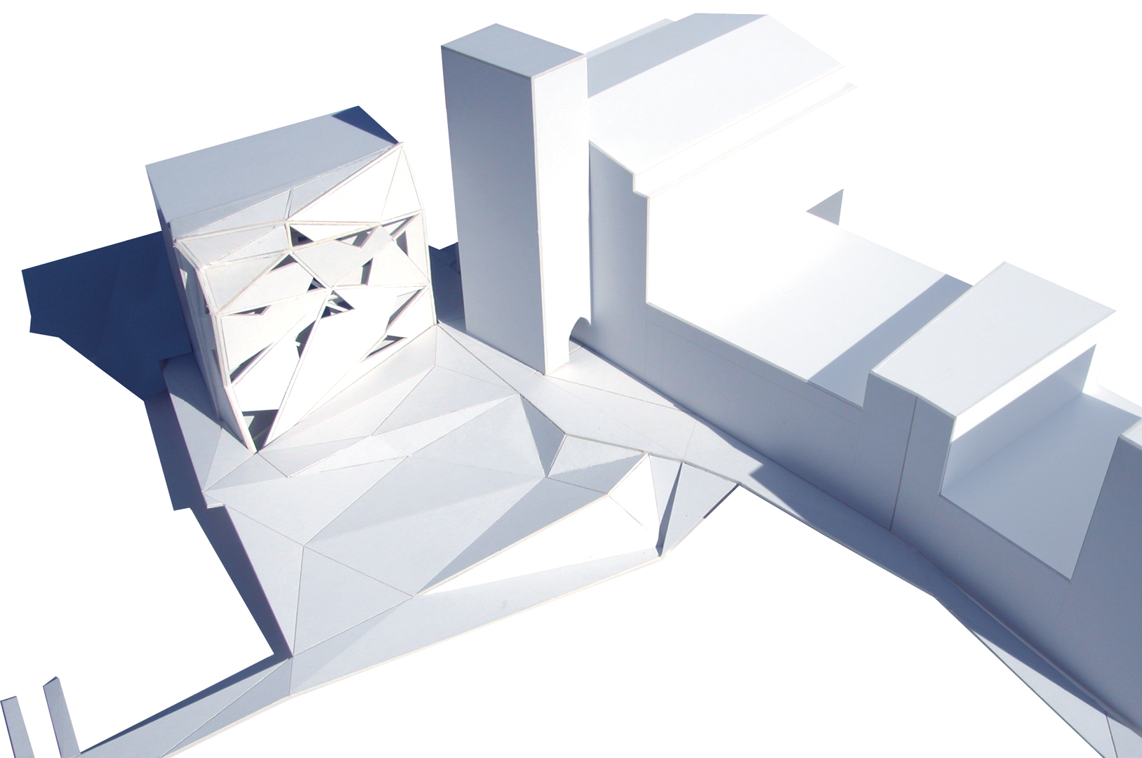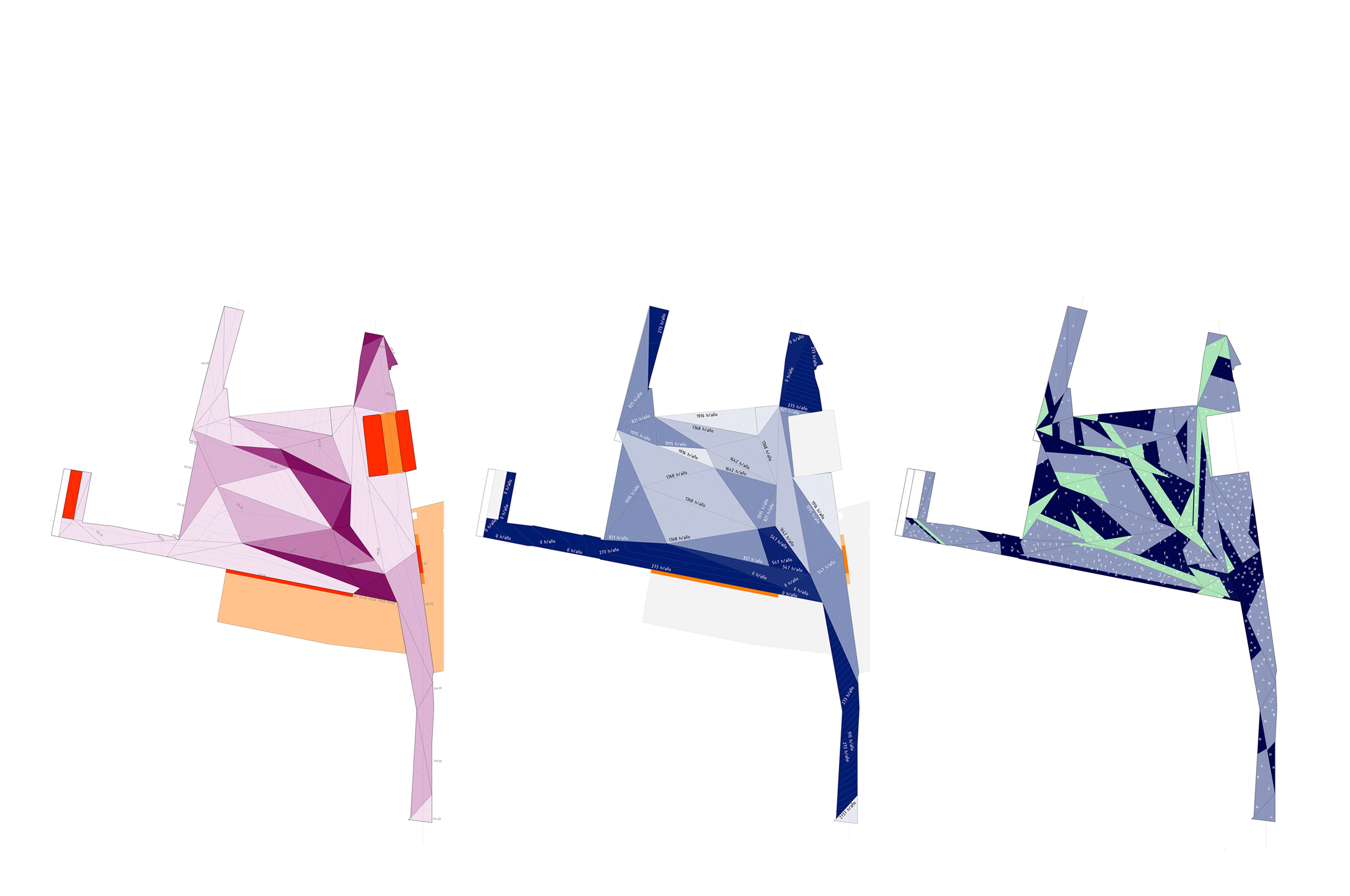 La plaza de los amantes, hoy en día, se encuentra diferenciada a su vez en varias plazas en diferentes cotas, conectadas entre sí por un complicado sistema de escaleras. La primera operación que realizamos es generar un único plano que conecta las diferentes cotas de su perímetro mediante un sistema de plegaduras que producen una suma de planos triangulares cuyas pendientes se establecen en función de los usos y recorridos que se desarrollan en la plaza. La continuidad entre los diferentes planos triangulares la determina la diferencia de pendiente entre ellos, produciéndose así una trama de circulaciones compatible con espacios más estáticos. El análisis de diversos condicionantes (continuidad, recogida de aguas, circulaciones, pendientes...) desemboca en una topografía cambiante que es capaz de resolver las diferencias de cota de los accesos a los diferentes focos de interés de la plaza sin romper su continuidad perceptiva y funcional.