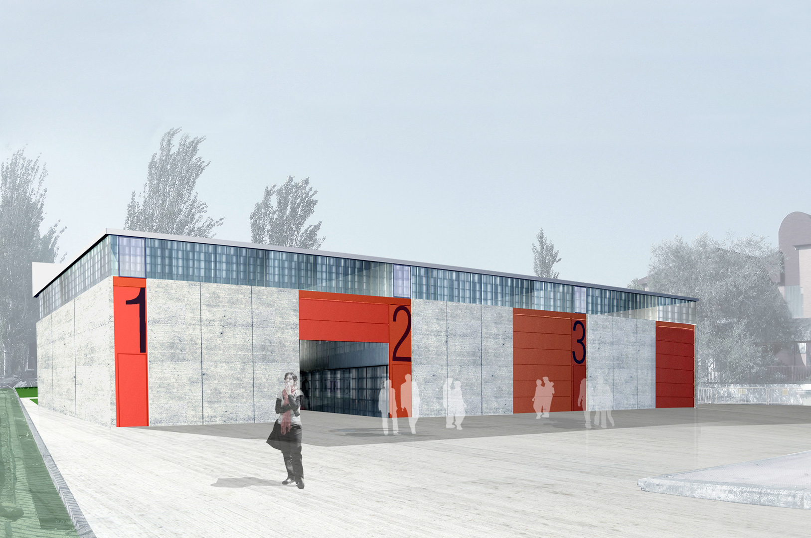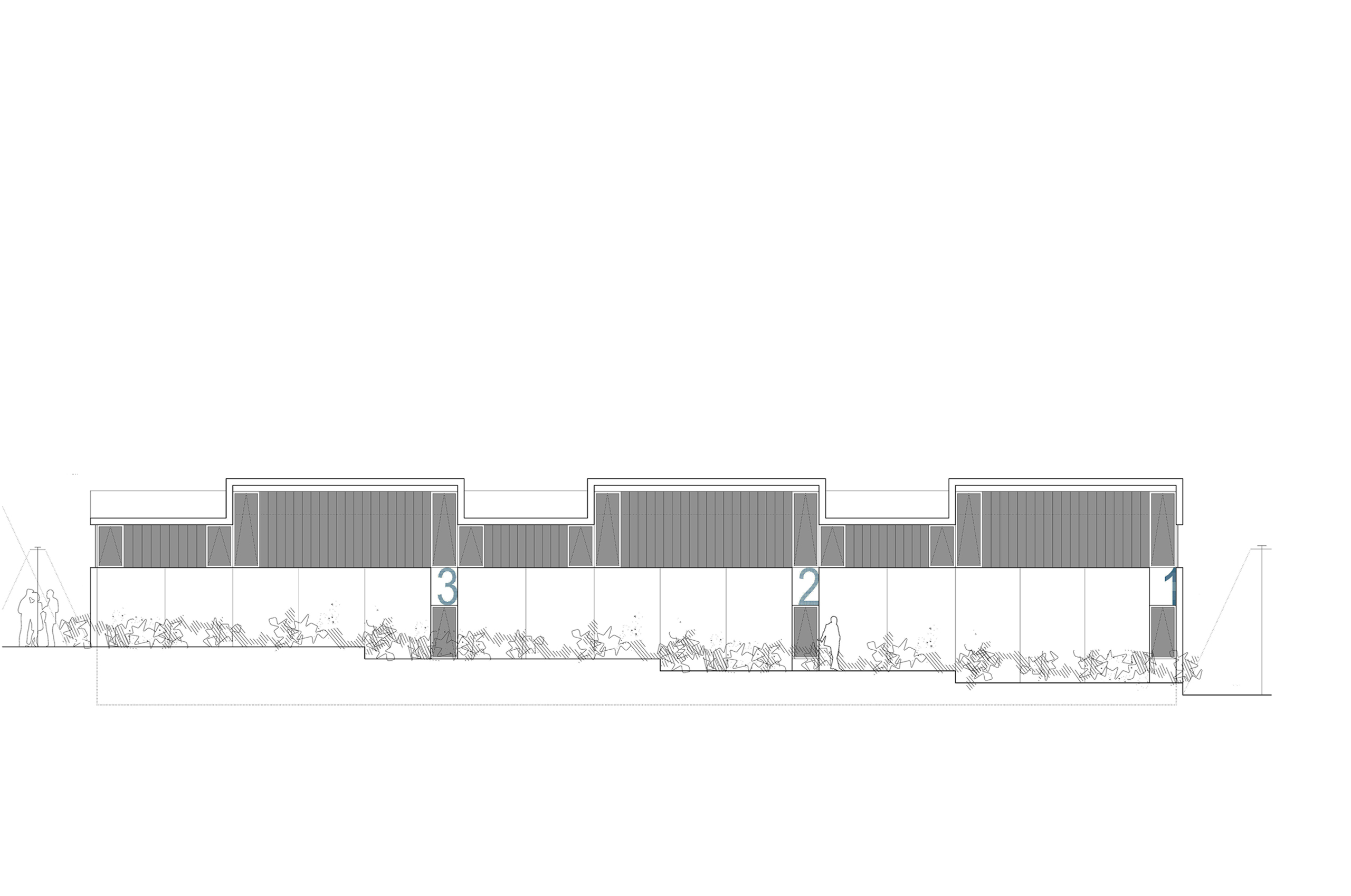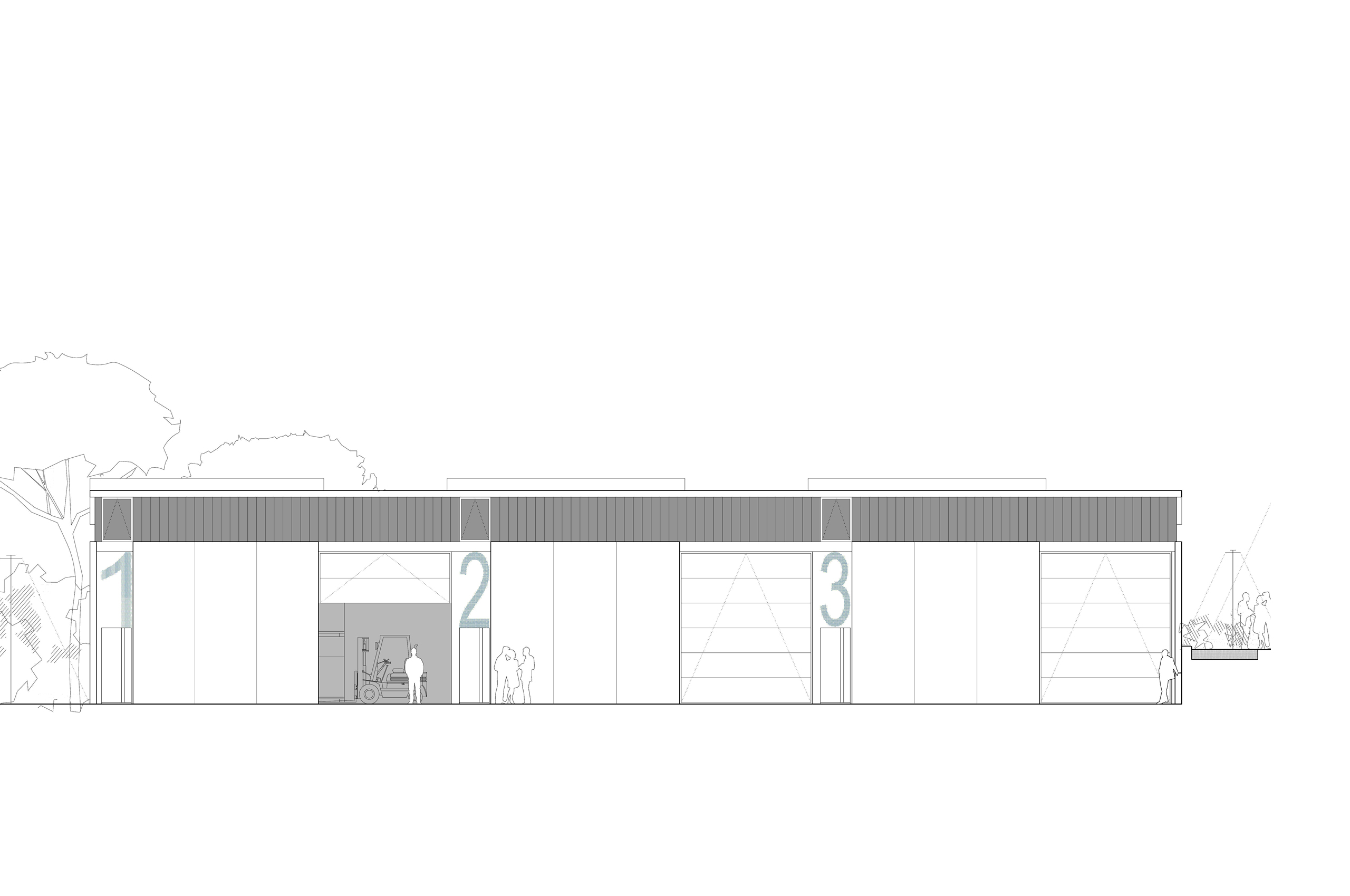 La nave para talleres se proyecta como un único volumen edificado, subdividido en tres talleres de dimensiones iguales. Un basamento inferior continuo, que aloja los accesos a cada uno de los talleres (un acceso peatonal y una puerta seccional para cada taller), se independiza de la cubierta mediante una franja de luz continua que recorre todo el perímetro de la edificación.