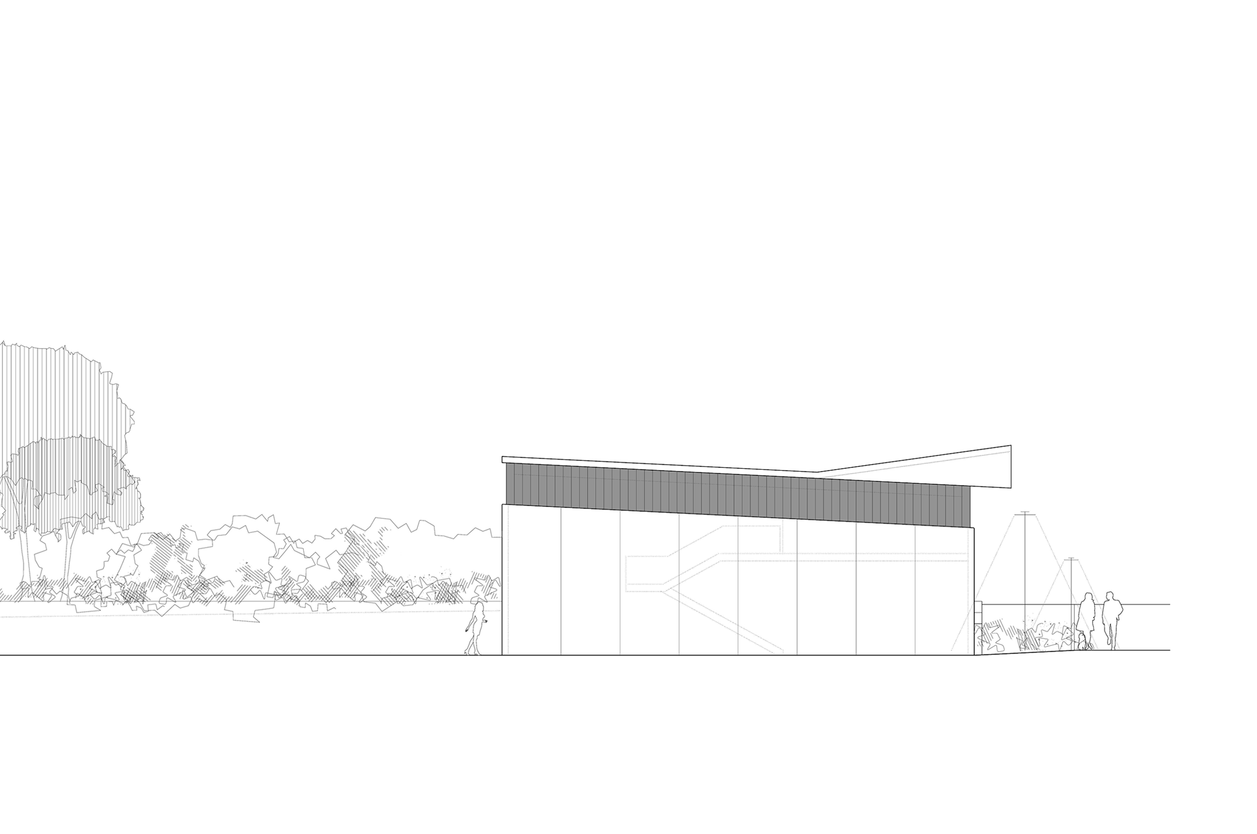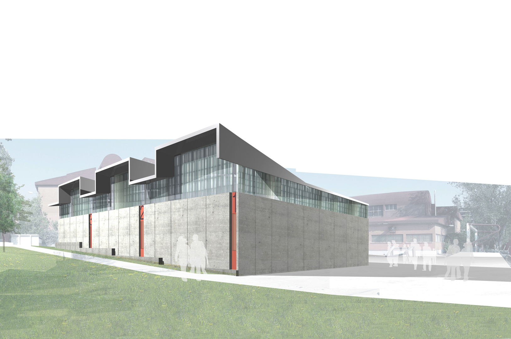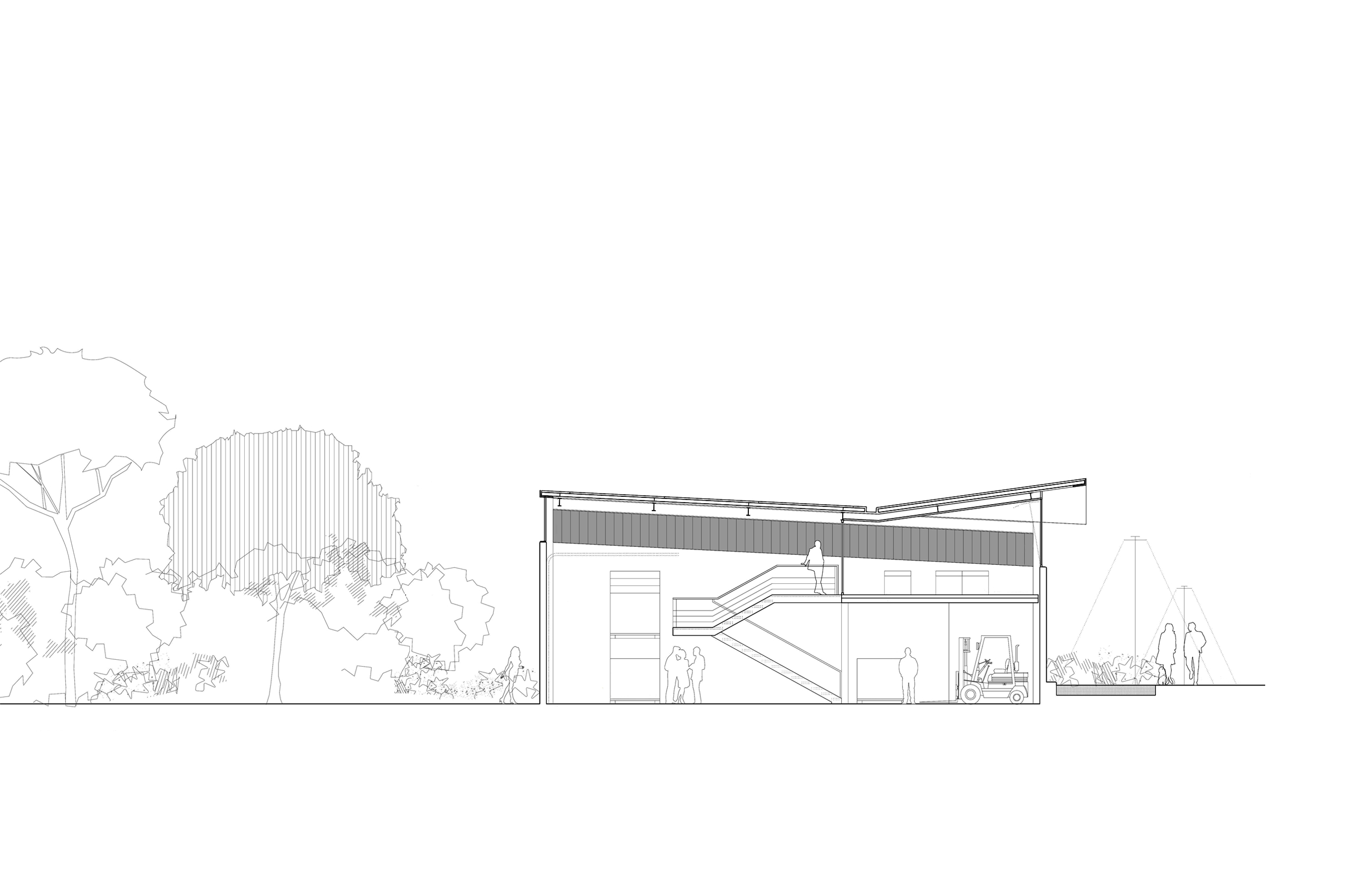 La nave para talleres se proyecta como un único volumen edificado, subdividido en tres talleres de dimensiones iguales. Un basamento inferior continuo, que aloja los accesos a cada uno de los talleres (un acceso peatonal y una puerta seccional para cada taller), se independiza de la cubierta mediante una franja de luz continua que recorre todo el perímetro de la edificación.