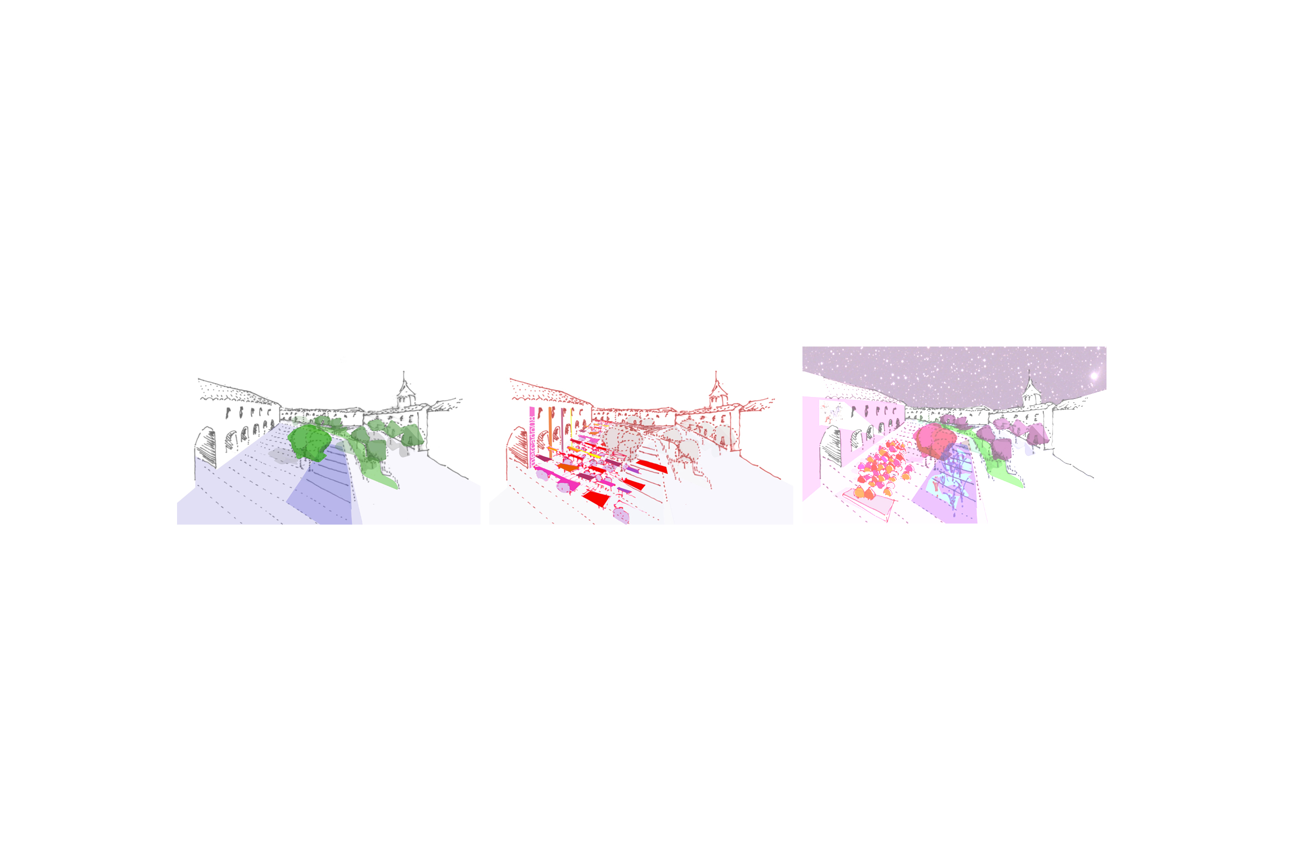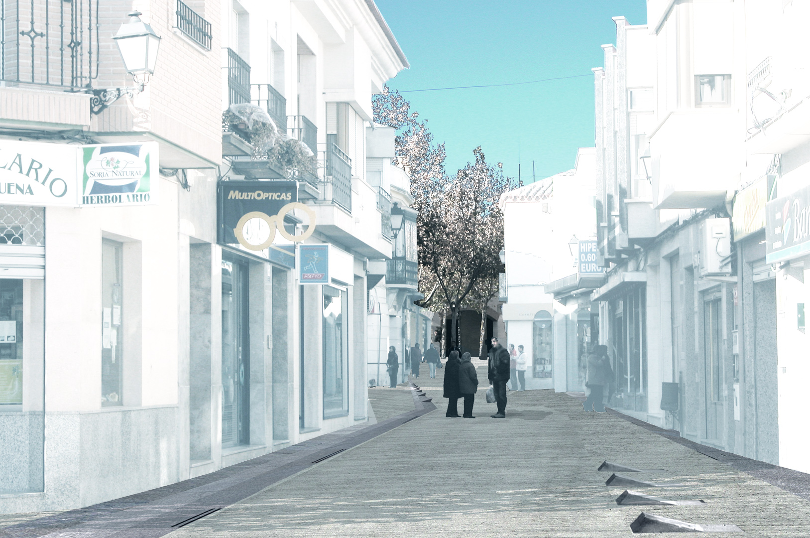 La remodelación de la Plaza de España y calles adyacentes unifica y valora los elementos arquitectónicos y urbanísticos catalogados en Villacañas, creando un Salón Urbano que relaciona y da acceso al Mercado (edificio de gran interés para alojar un equipamiento cultural público), el Ayuntamiento, la Iglesia de Nuestra Señora de la Asunción, el Casino, el Teatro, y a otros edificios privados de claro interés arquitectónico como son algunos edificios resindenciales, casonas y casas solariegas catalogados. Proponemos un uso peatonal prioritario que enlace los diferentes lugares públicos de interés del centro de Villacañas y que resuelva los accesos de los diferentes servicios (públicos y privados) que son los que vitalizan y mantienen una actividad ciudadana intensa y constante.