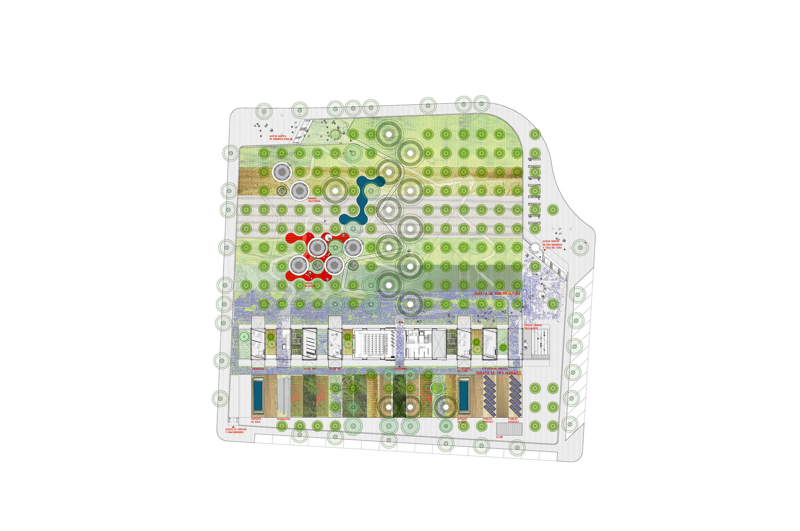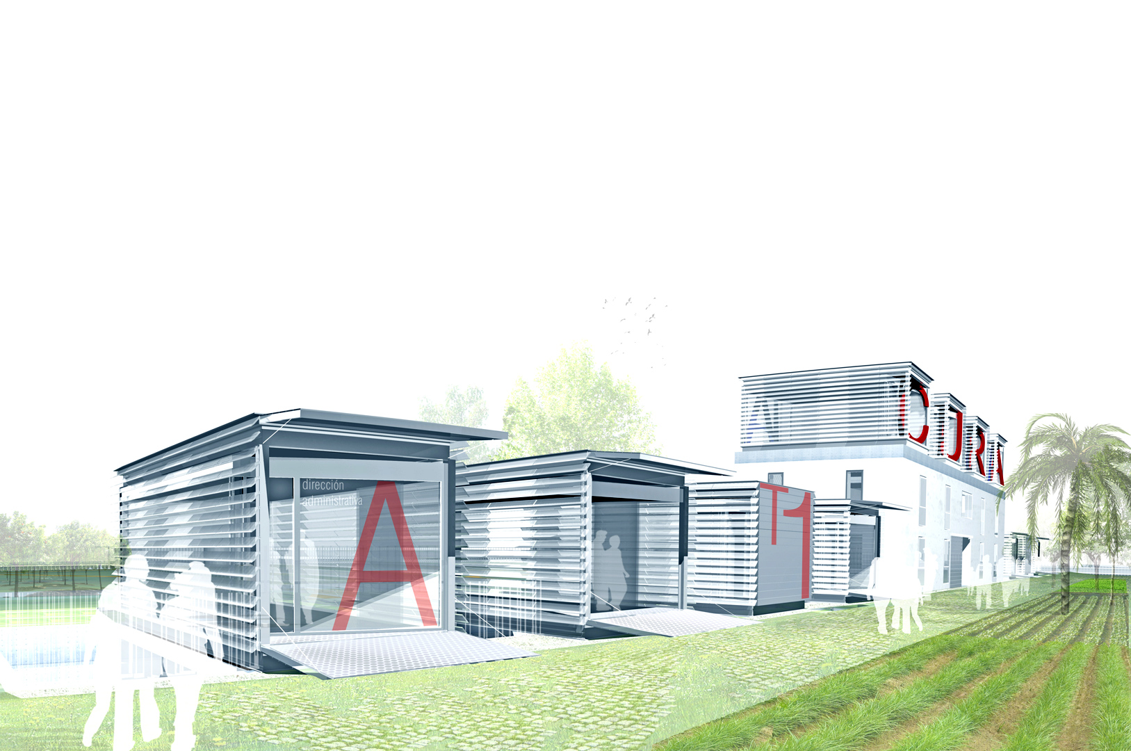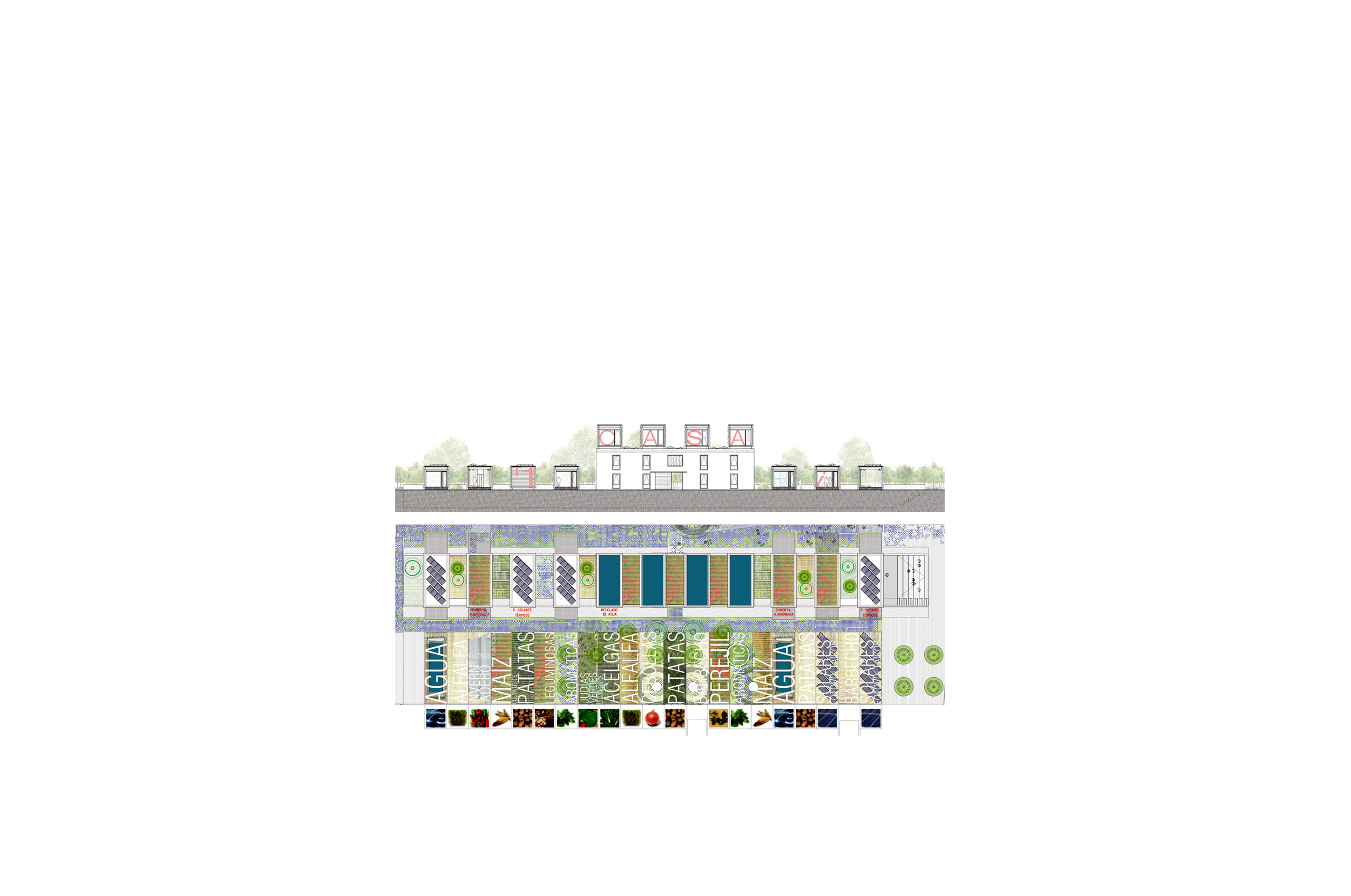 Producimos en taller un conjunto de 11 "cajas" ligeras de estructura metálica, que posamos en todo el desarrollo longitudinal del edificio existente a rehabilitar (4 cajas haciendo las veces de cubierta de la Casa Solariega (lucernarios) y las 7 restantes sobre cota 0) funcionando estructuralmente como puentes bi-apoyados. Con esta operación conseguimos servir de puentes de conexión entre las dos tipologías de huertas así como resolver las necesidades funcionales, climáticas y perceptivas del centro.
