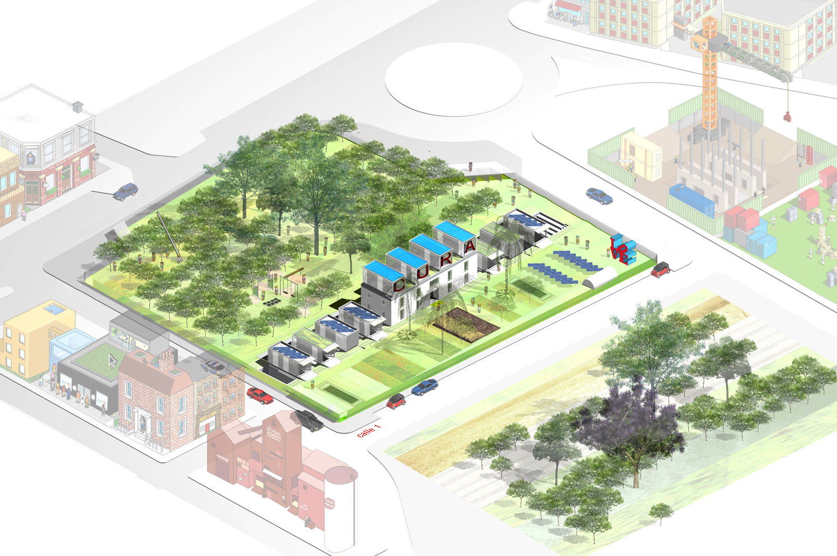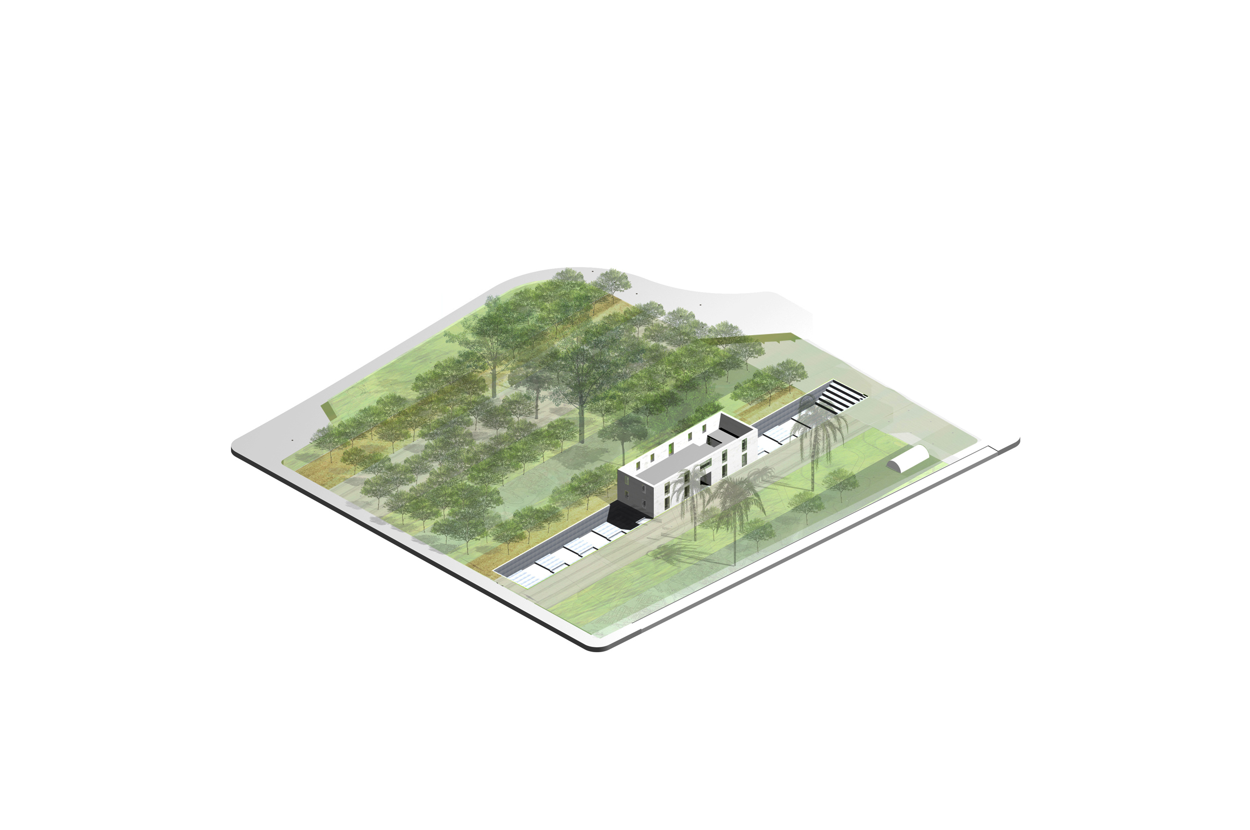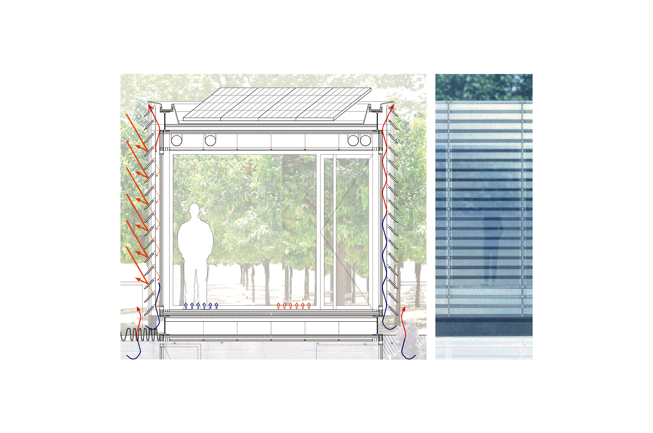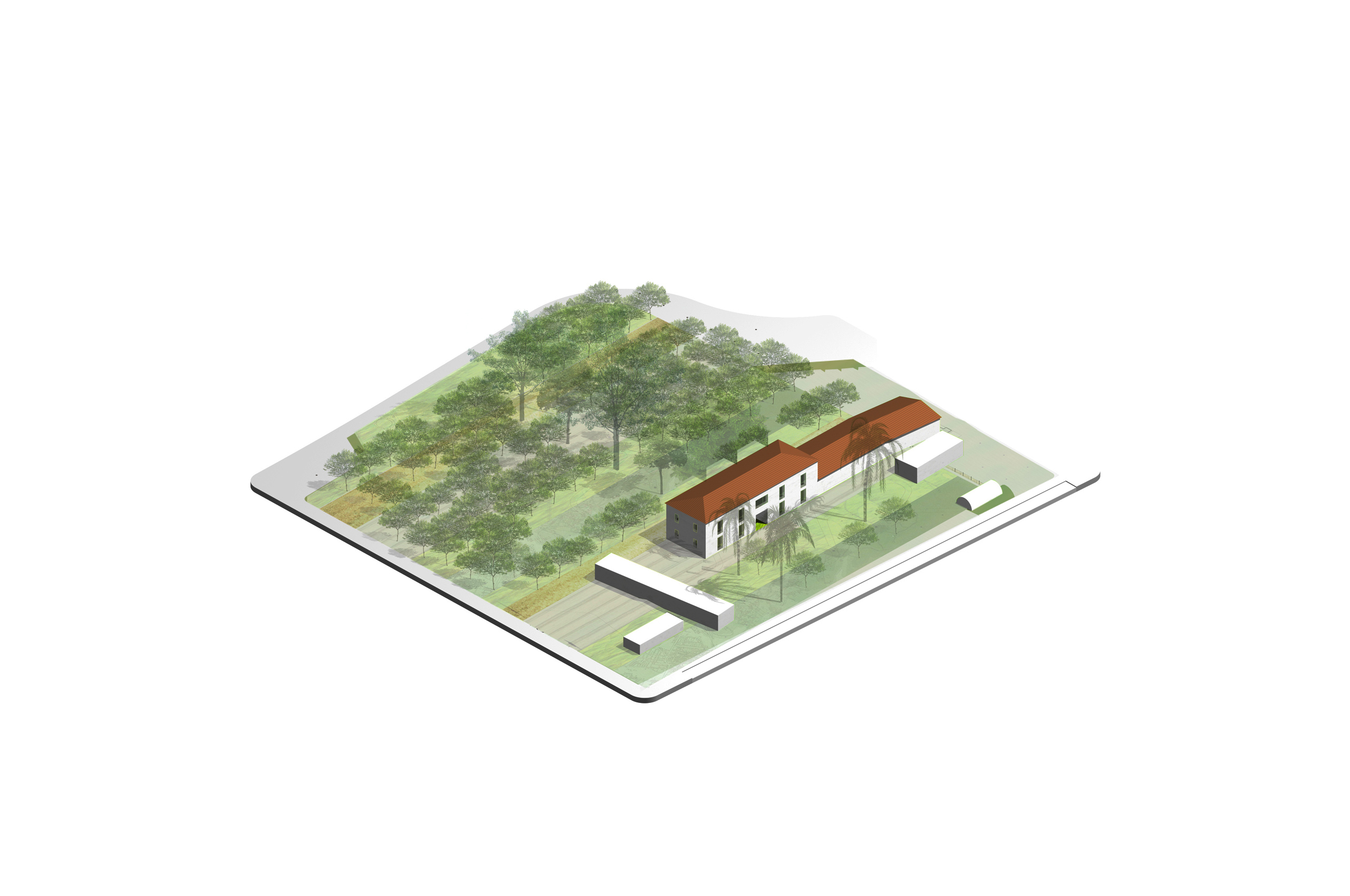 Producimos en taller un conjunto de 11 "cajas" ligeras de estructura metálica, que posamos en todo el desarrollo longitudinal del edificio existente a rehabilitar (4 cajas haciendo las veces de cubierta de la Casa Solariega (lucernarios) y las 7 restantes sobre cota 0) funcionando estructuralmente como puentes bi-apoyados. Con esta operación conseguimos servir de puentes de conexión entre las dos tipologías de huertas así como resolver las necesidades funcionales, climáticas y perceptivas del centro.