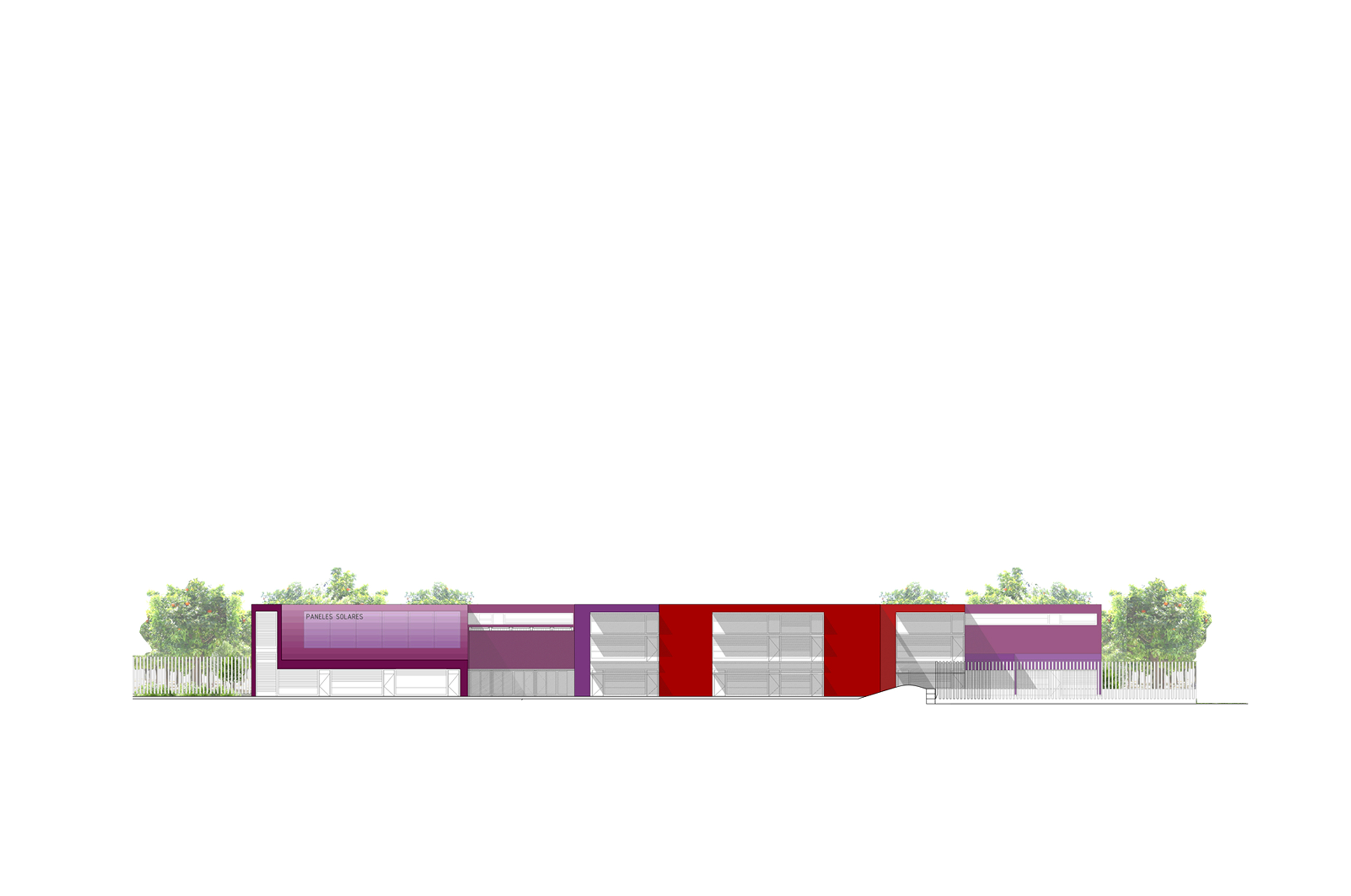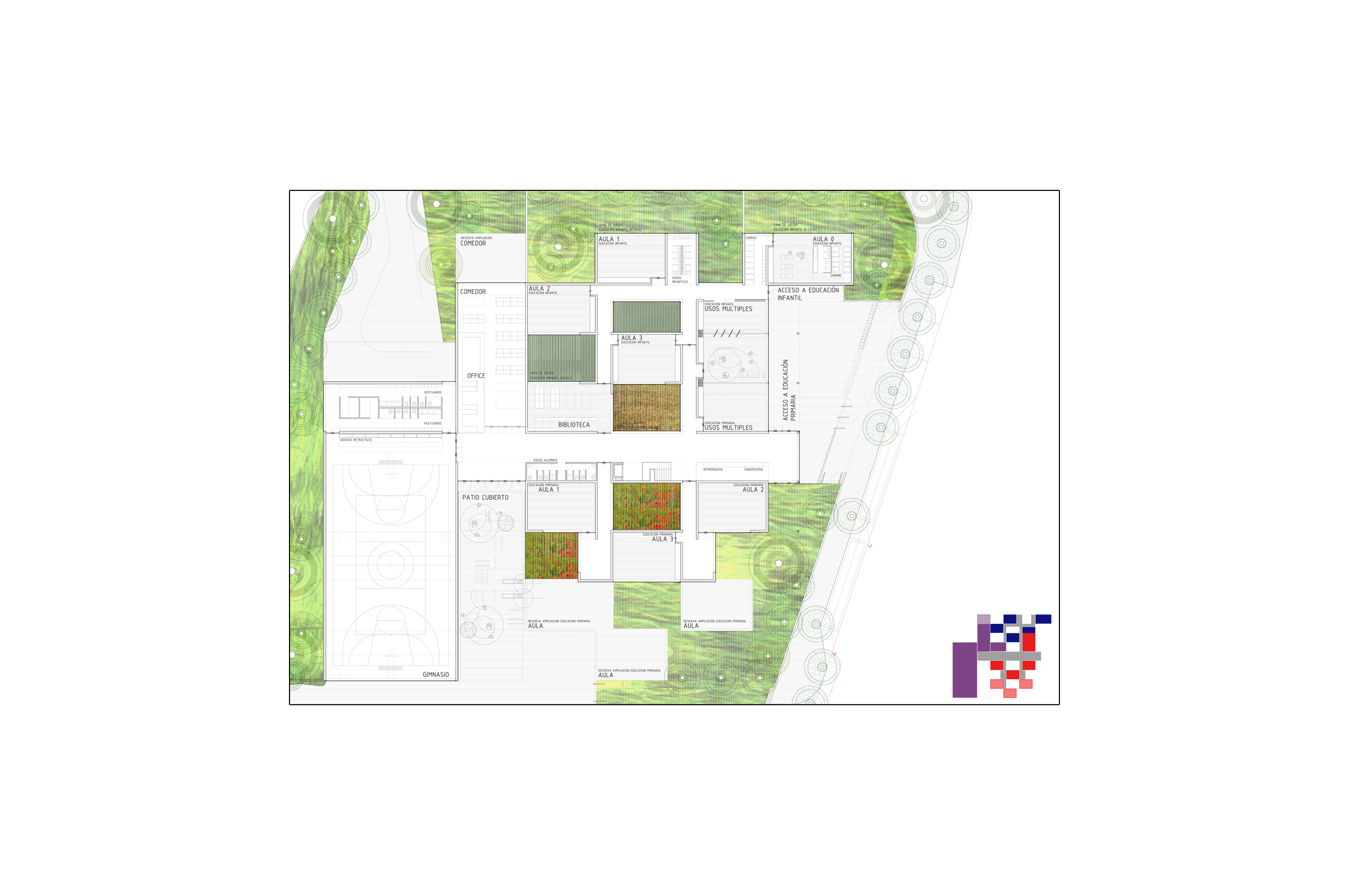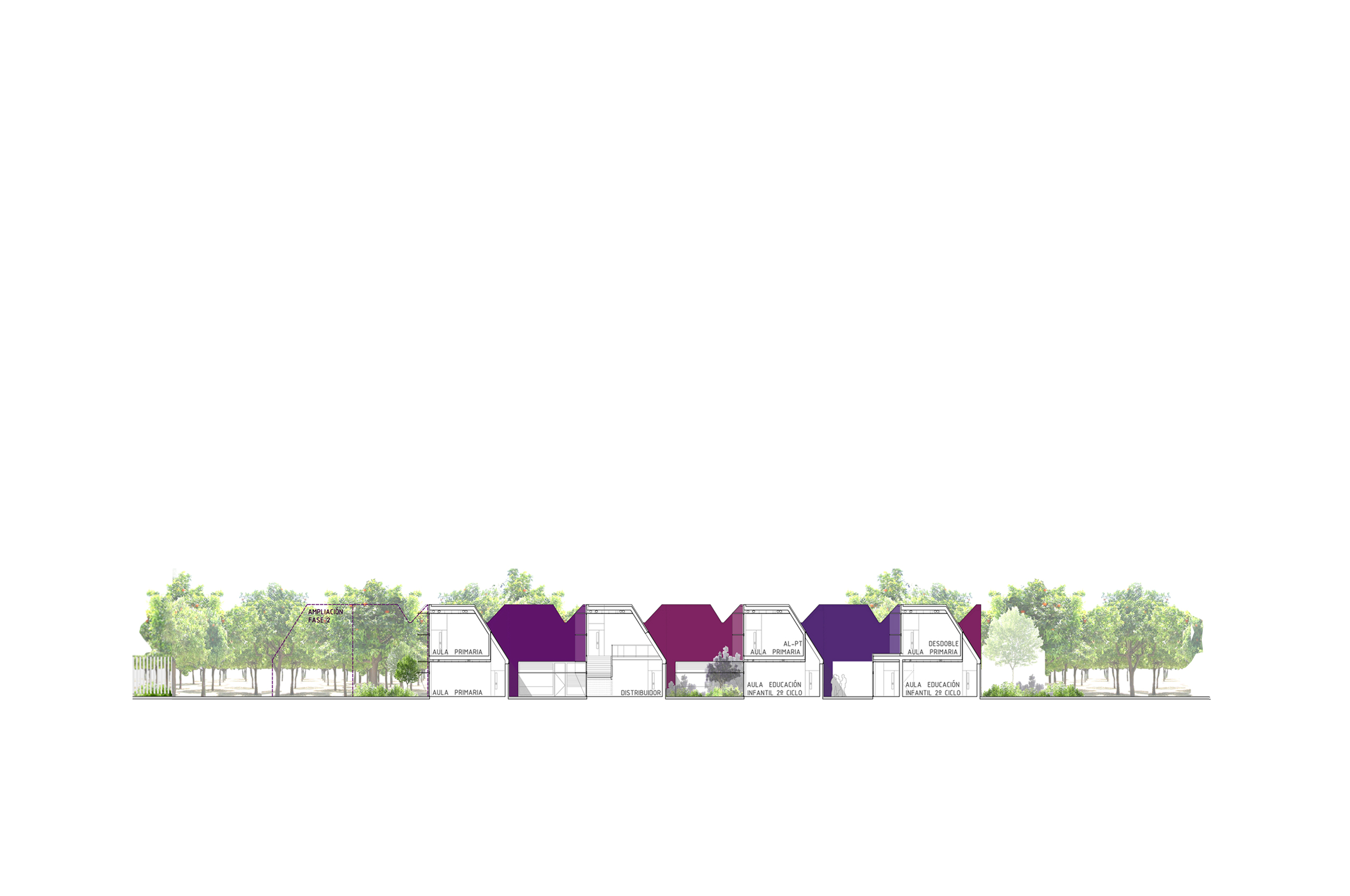 Buscamos un sistema sencillo y óptimo, tanto funcional como constructivamente. En este sentido planteamos el empleo de un único elemento que, mediante operaciones de adicción, extrusión y manipulación, genere el conjunto del proyecto, haciendo identificables sus leyes. Proponemos una red de aulas-patio, un sistema sencillo, flexible, cuya seriación de patios entre los elementos-base permiten no solo una buena iluminación y ventilación de las aulas sino también de los espacios de circulación que las unen. Además, nos permite, en las plantas bajas (aulas infantiles), establecer una relación directa con un espacio propio exterior.
