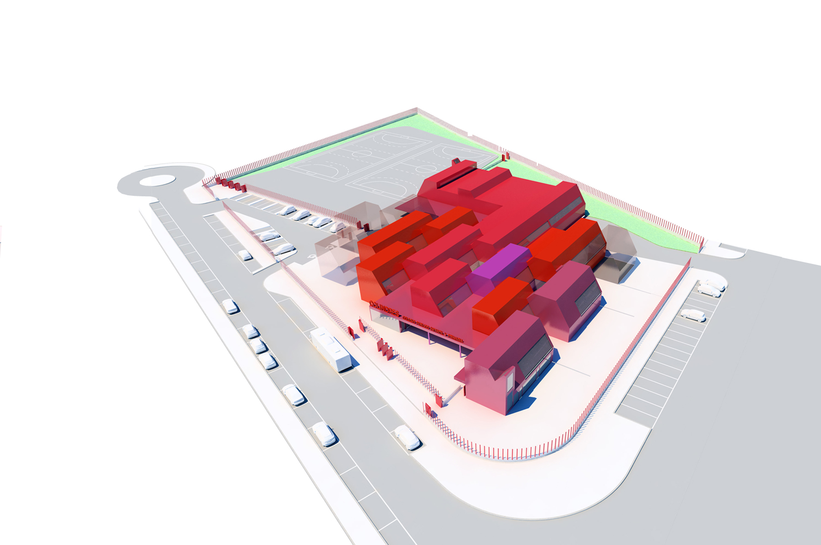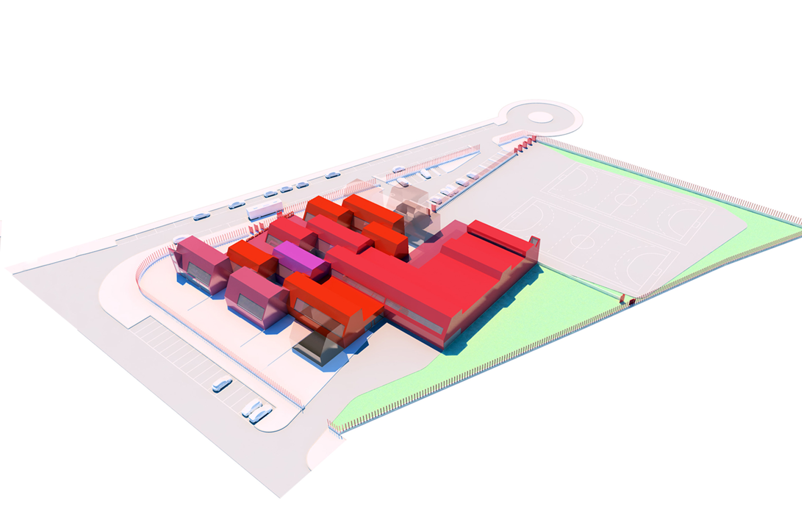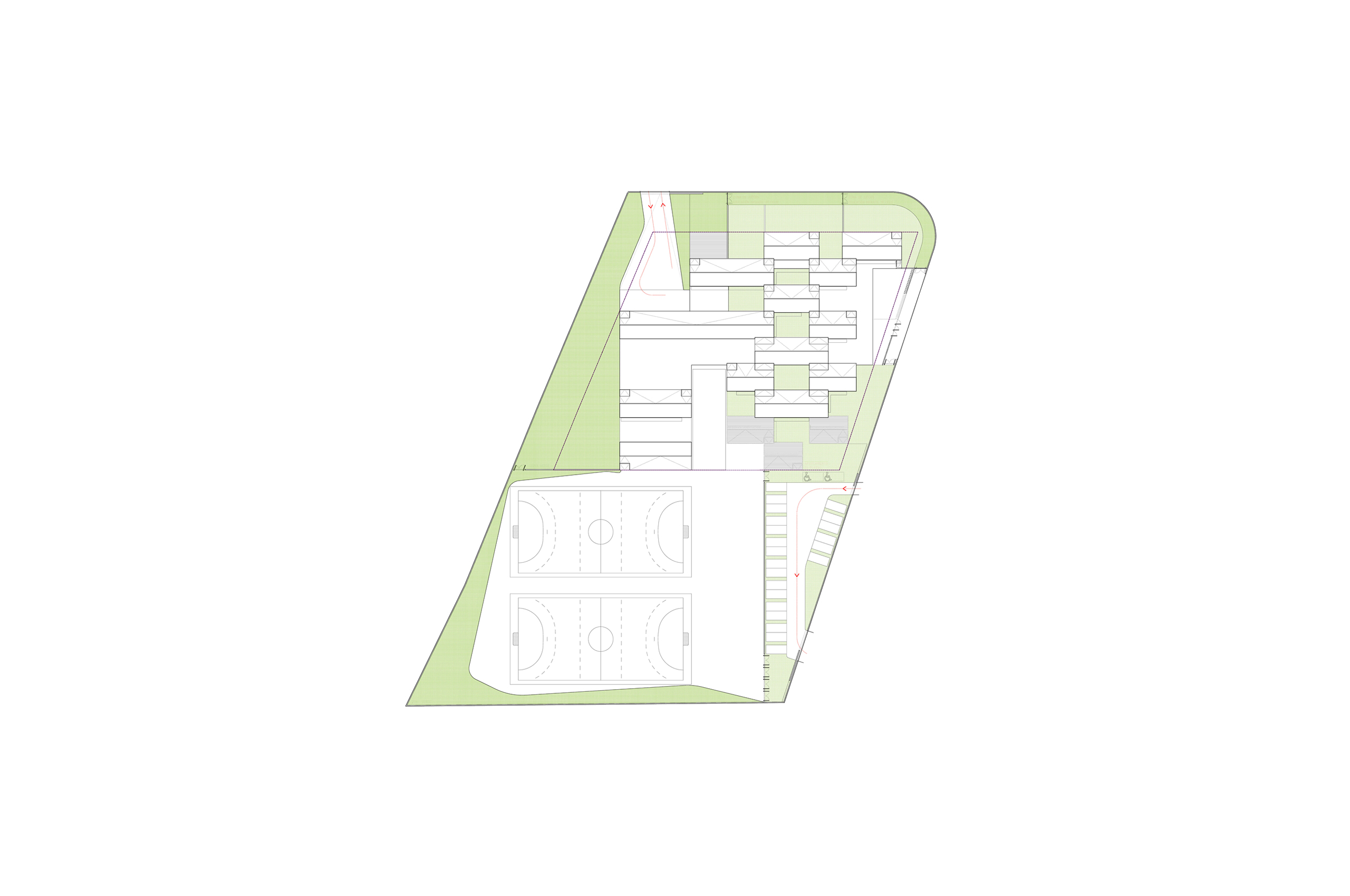 Buscamos un sistema sencillo y óptimo, tanto funcional como constructivamente. En este sentido planteamos el empleo de un único elemento que, mediante operaciones de adicción, extrusión y manipulación, genere el conjunto del proyecto, haciendo identificables sus leyes. Proponemos una red de aulas-patio, un sistema sencillo, flexible, cuya seriación de patios entre los elementos-base permiten no solo una buena iluminación y ventilación de las aulas sino también de los espacios de circulación que las unen. Además, nos permite, en las plantas bajas (aulas infantiles), establecer una relación directa con un espacio propio exterior.