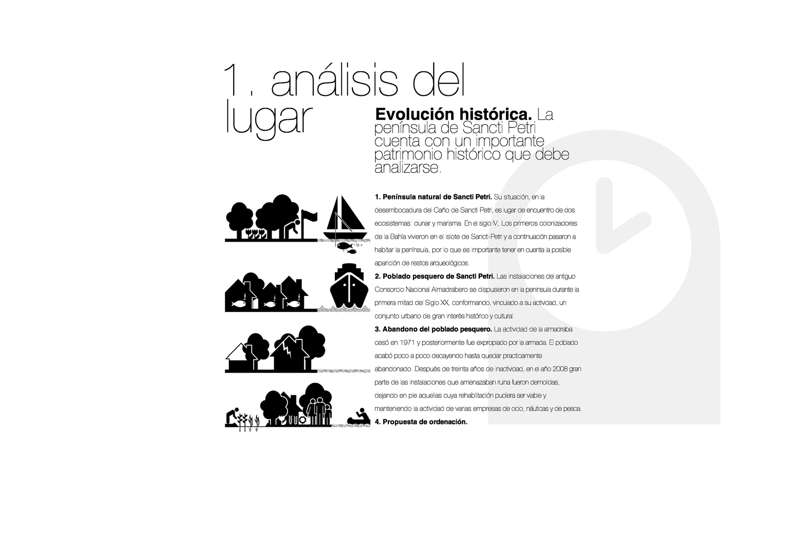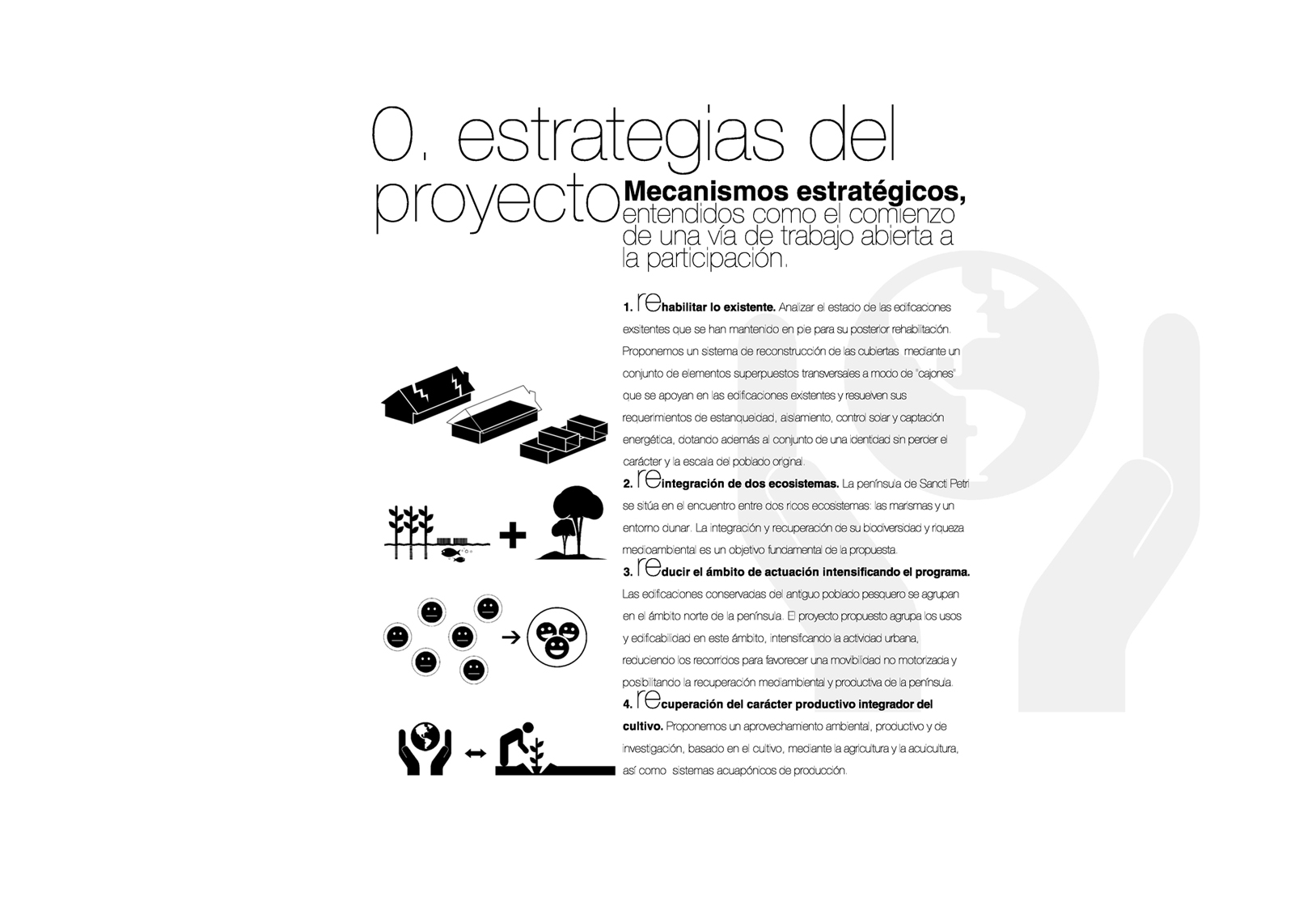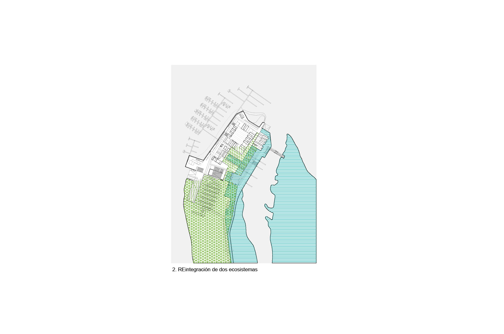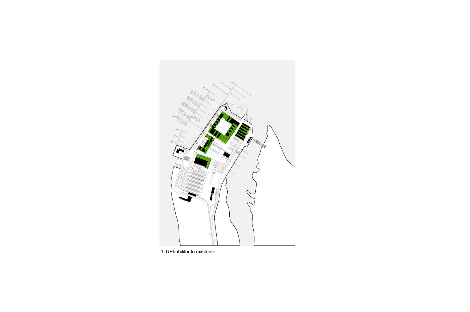 3. REducir el ámbito de actuación intensificando el programa. Las edificaciones conservadas del antiguo poblado pesquero se agrupan en el ámbito norte de la península. El proyecto propuesto agrupa los usos y edificabilidad en este ámbito, intensificando la actividad urbana, reduciendo los recorridos para favorecer una movibilidad no motorizada y posibilitando la recuperación mediambiental y productiva de la península.