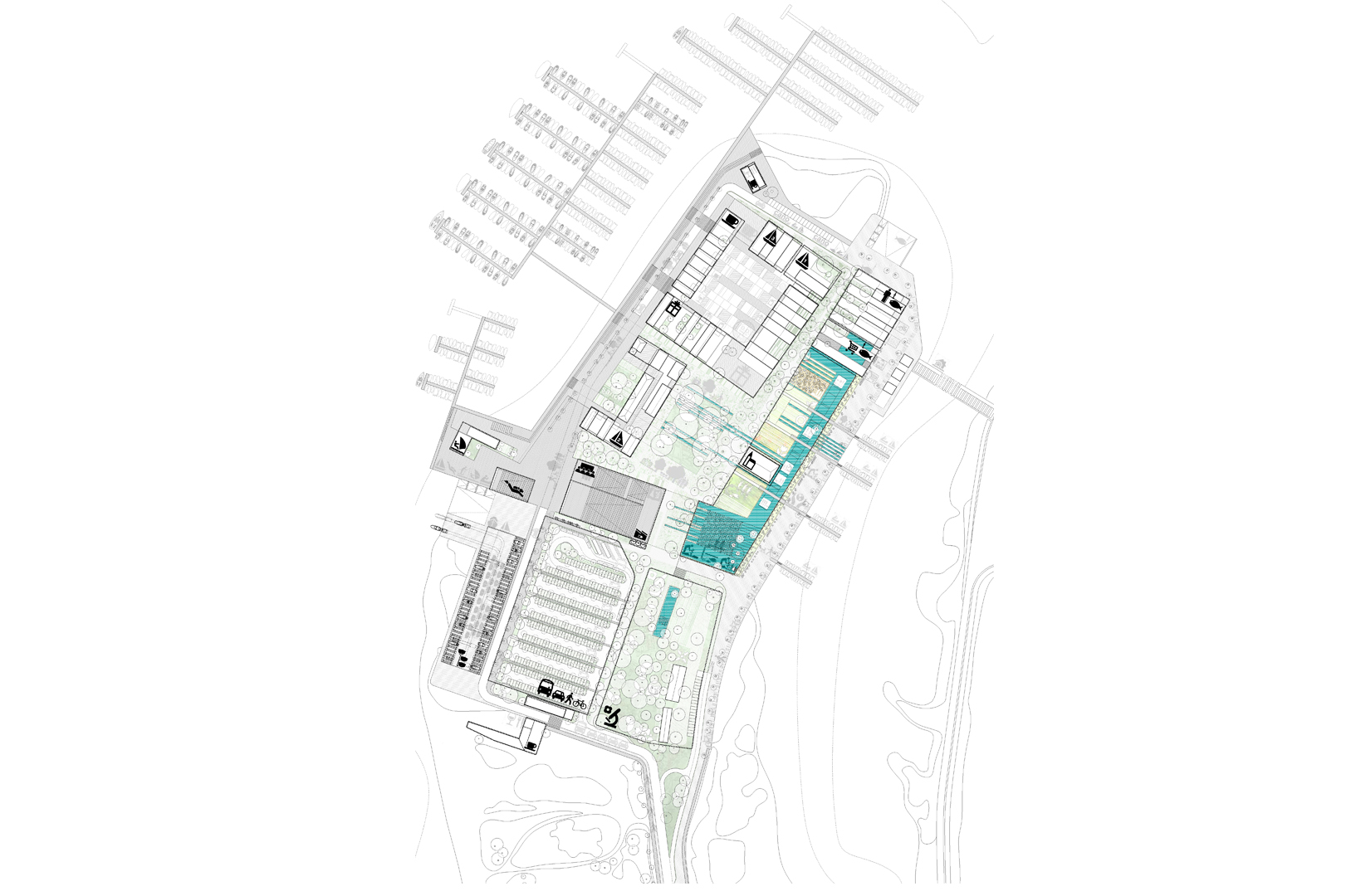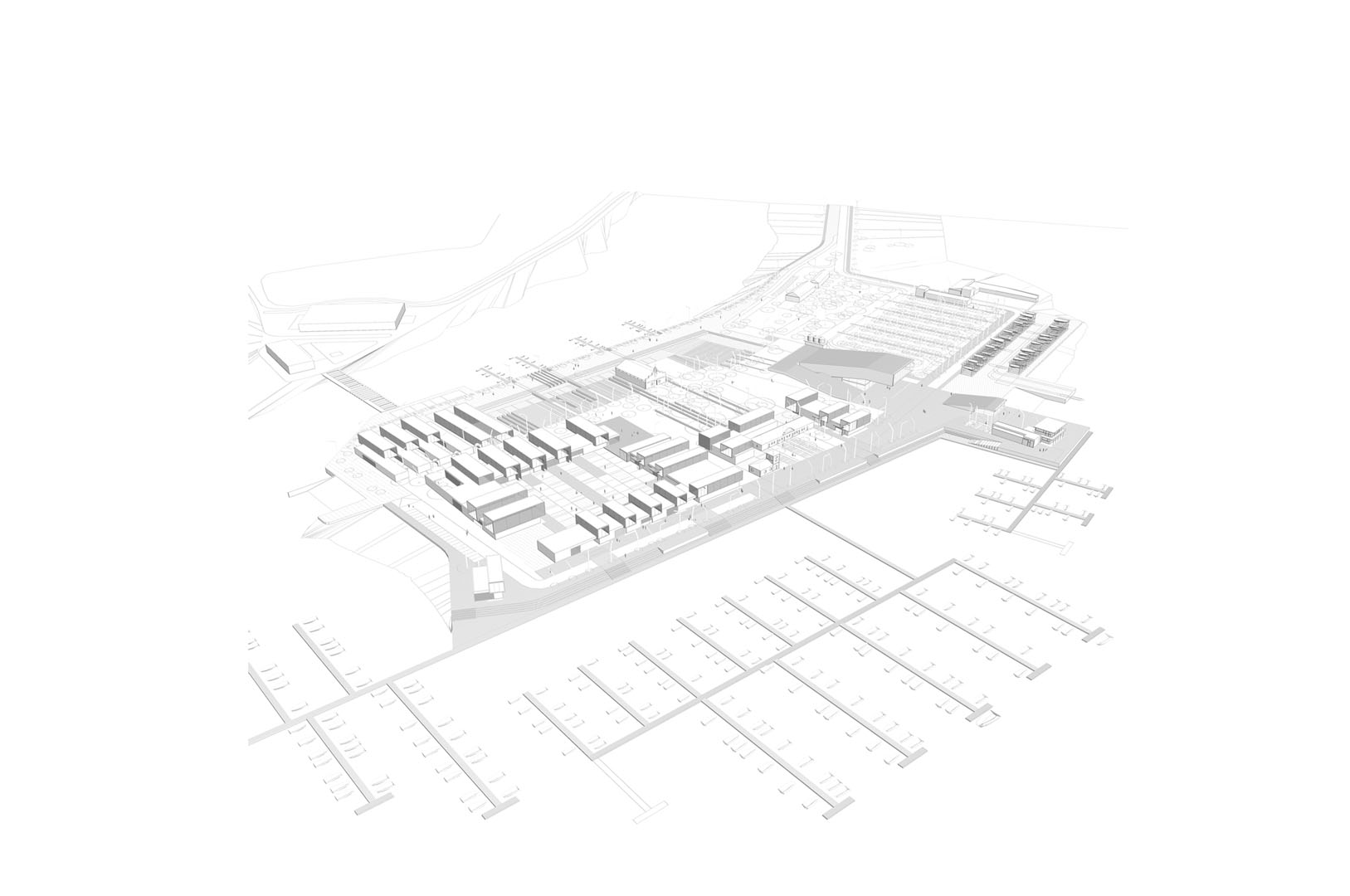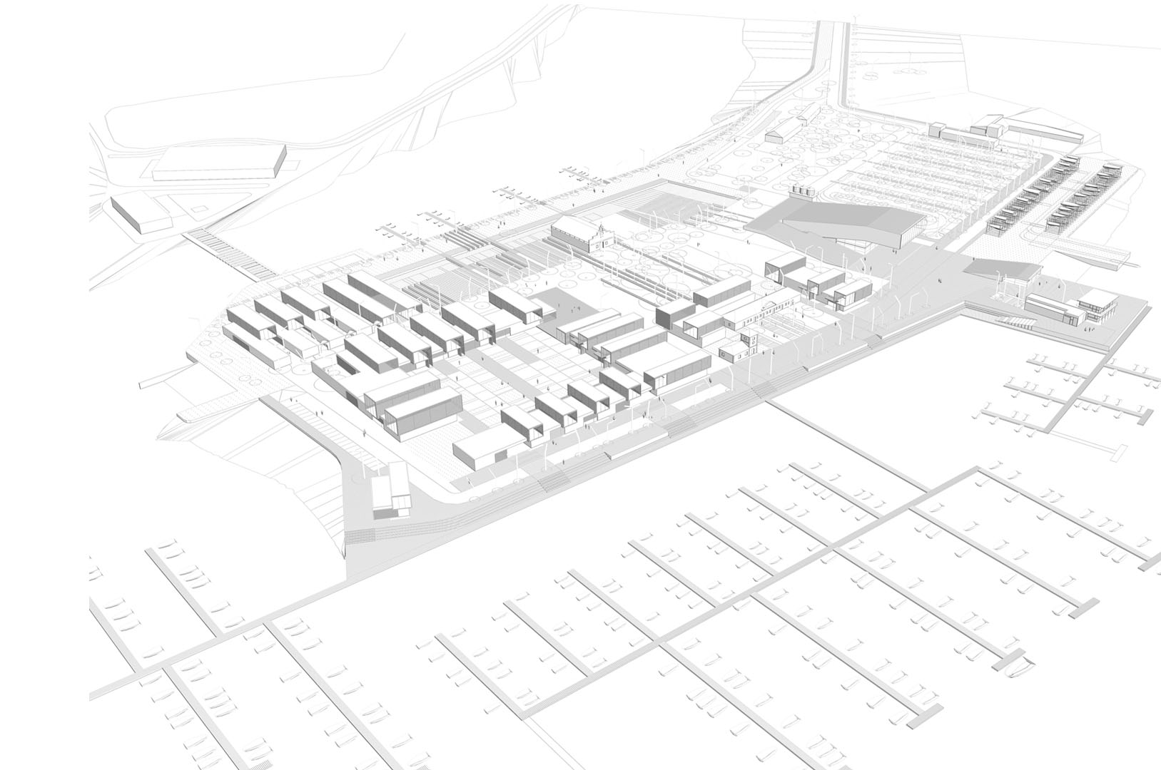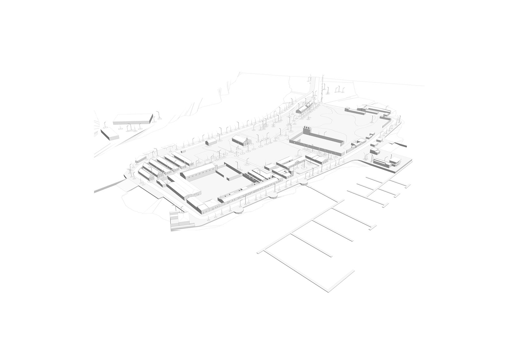 3. REducir el ámbito de actuación intensificando el programa. Las edificaciones conservadas del antiguo poblado pesquero se agrupan en el ámbito norte de la península. El proyecto propuesto agrupa los usos y edificabilidad en este ámbito, intensificando la actividad urbana, reduciendo los recorridos para favorecer una movibilidad no motorizada y posibilitando la recuperación mediambiental y productiva de la península.