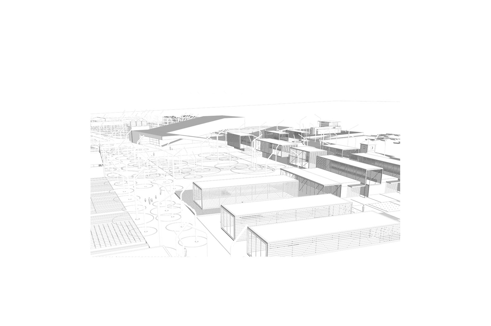 1. REhabilitar lo existente. Analizar el estado de las edificaciones exsitentes que se han mantenido en pie para su posterior rehabilitación. Proponemos un sistema de reconstrucción de las cubiertas mediante un conjunto de elementos superpuestos transversales a modo de "cajones" que se apoyan en las edificaciones existentes y resuelven sus requerimientos de estanqueidad, aislamiento, control solar y captación energética, dotando además al conjunto de una identidad sin perder el carácter y la escala del poblado original.