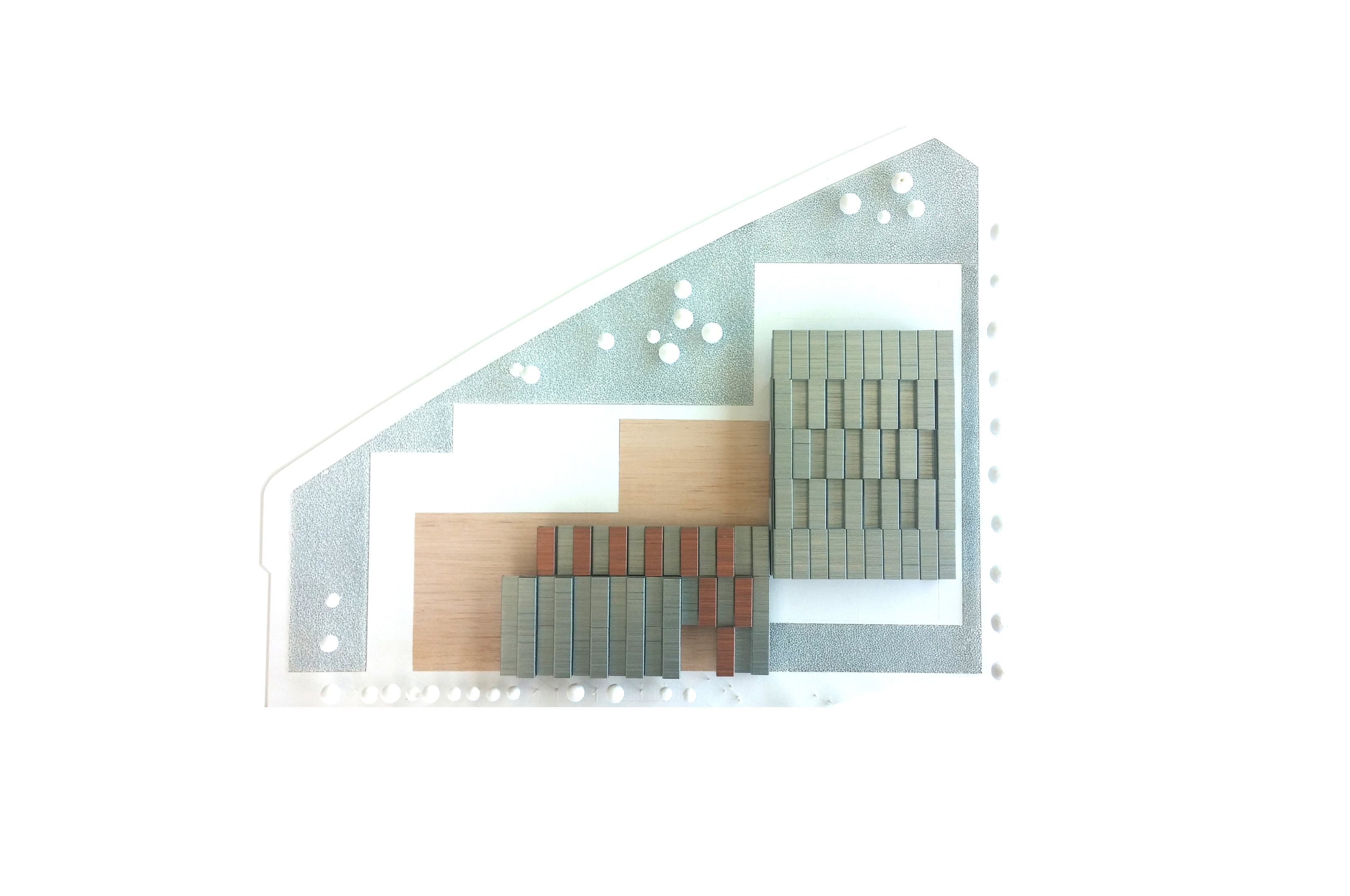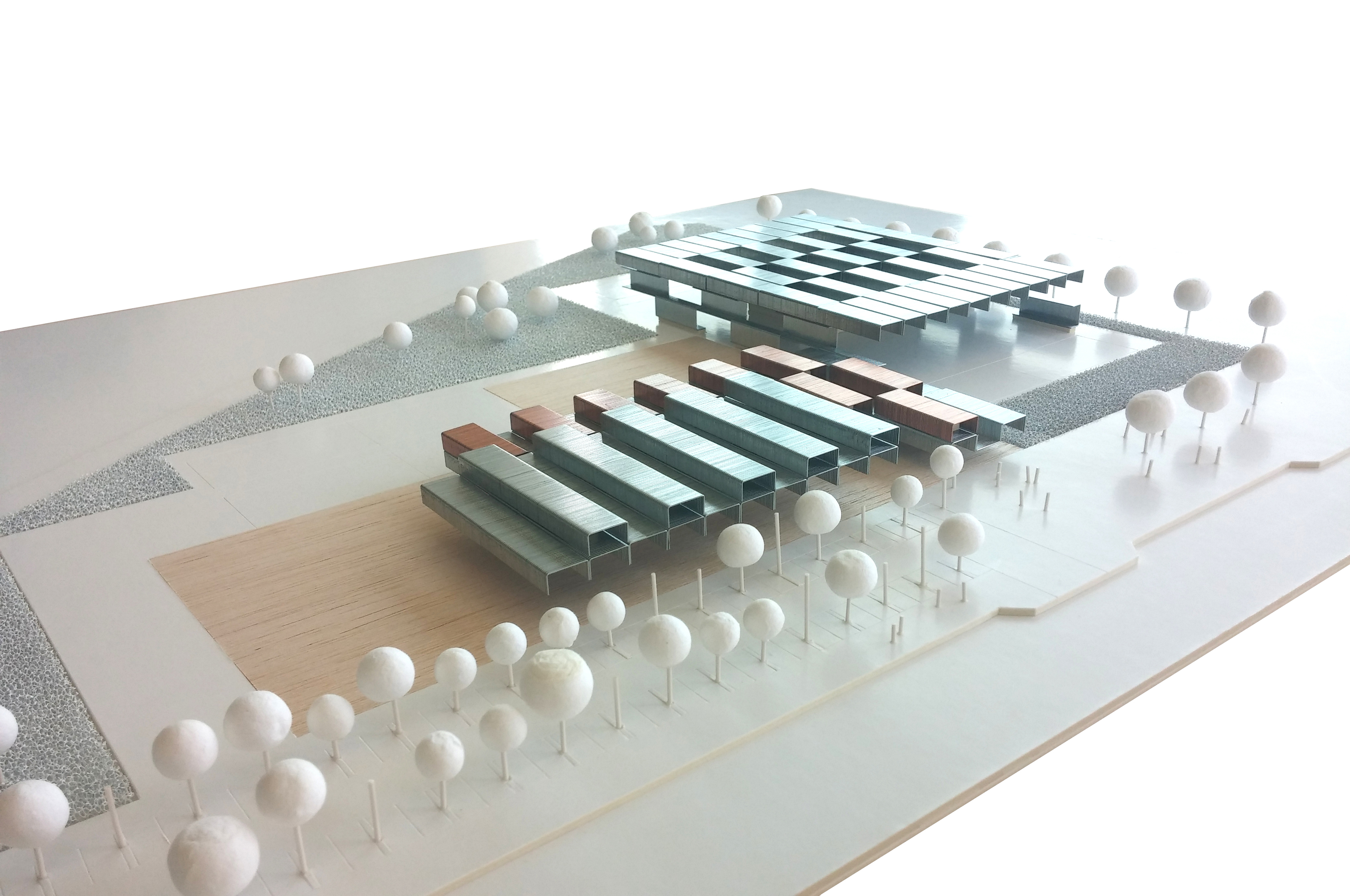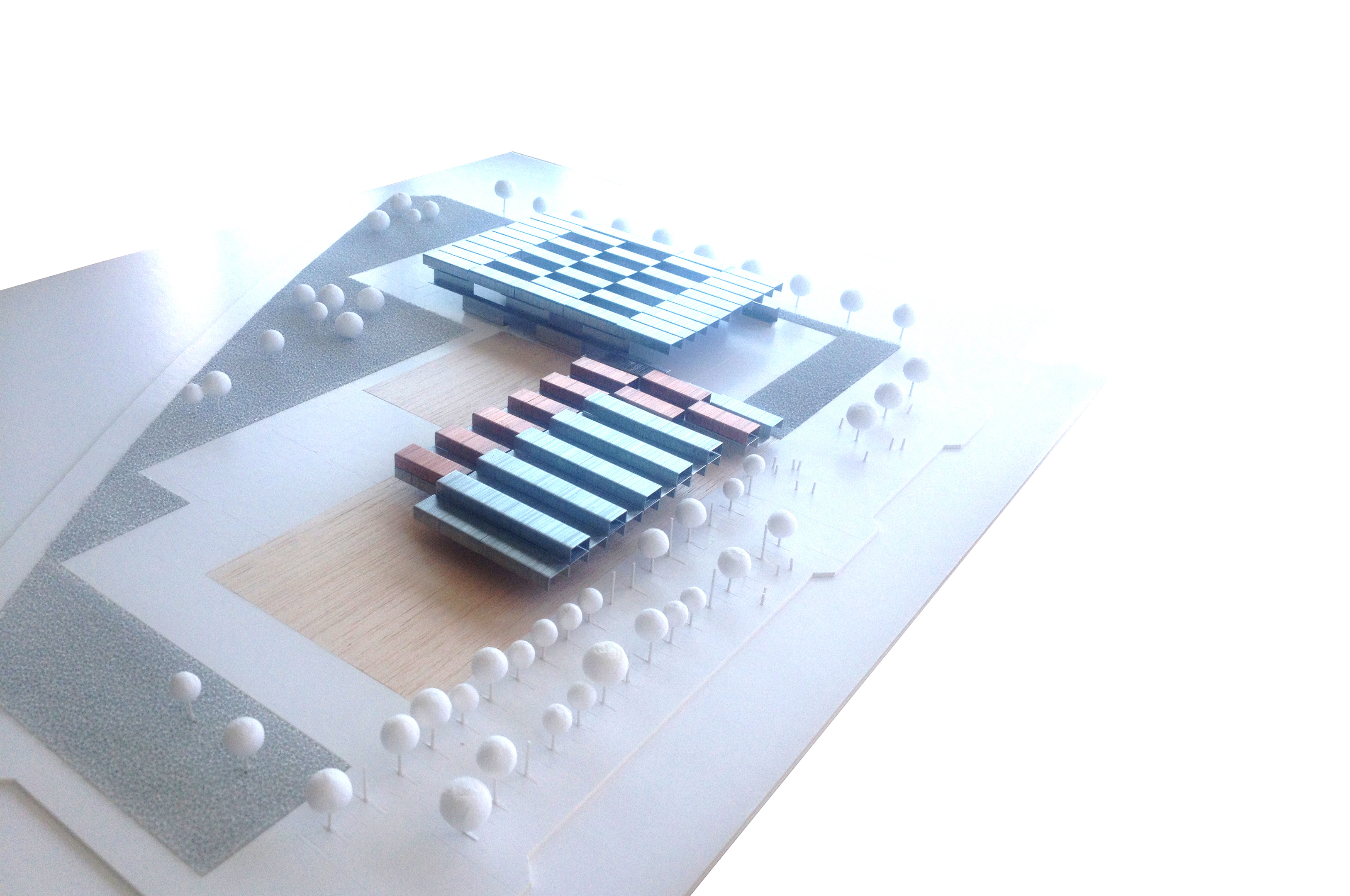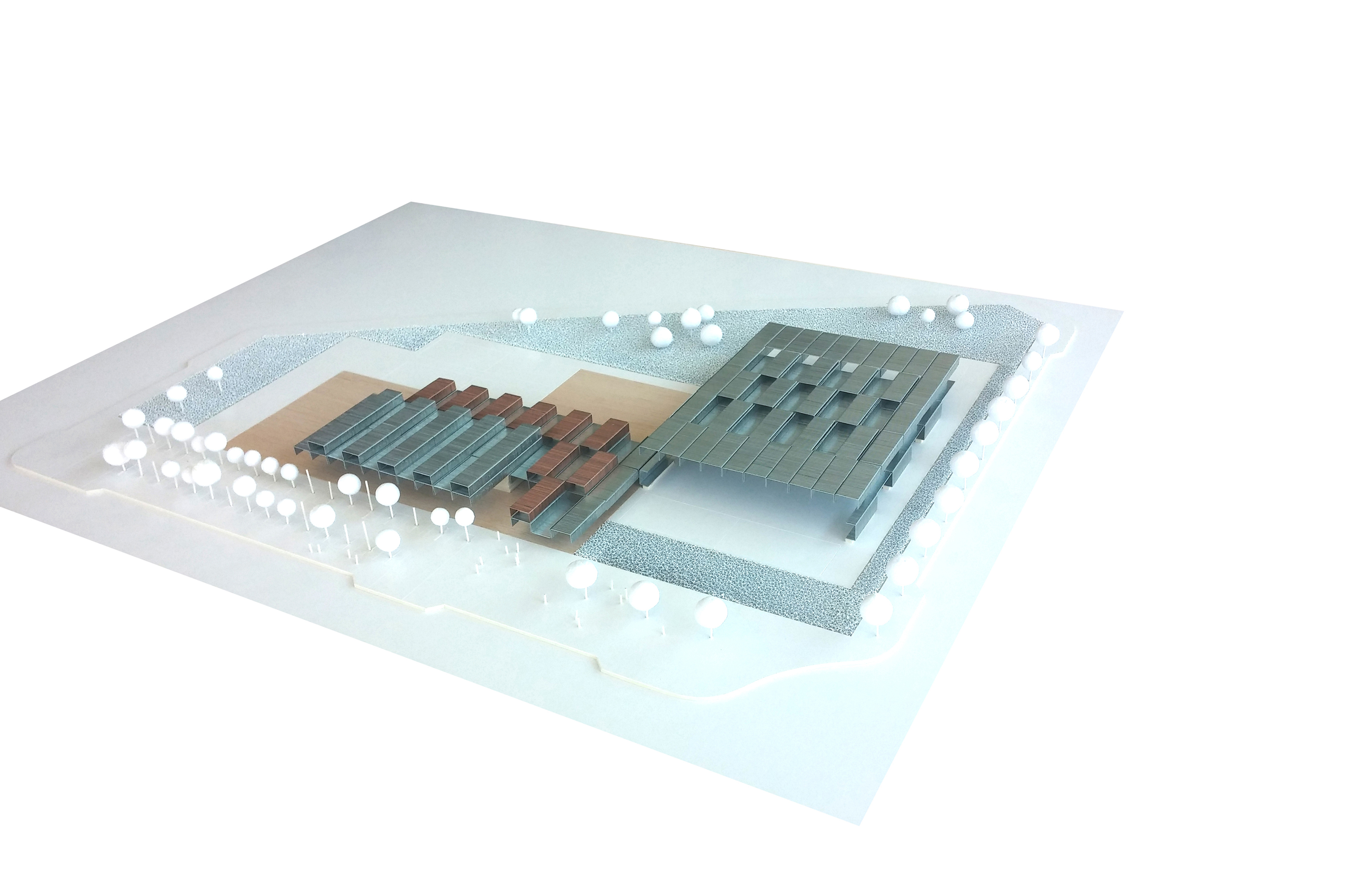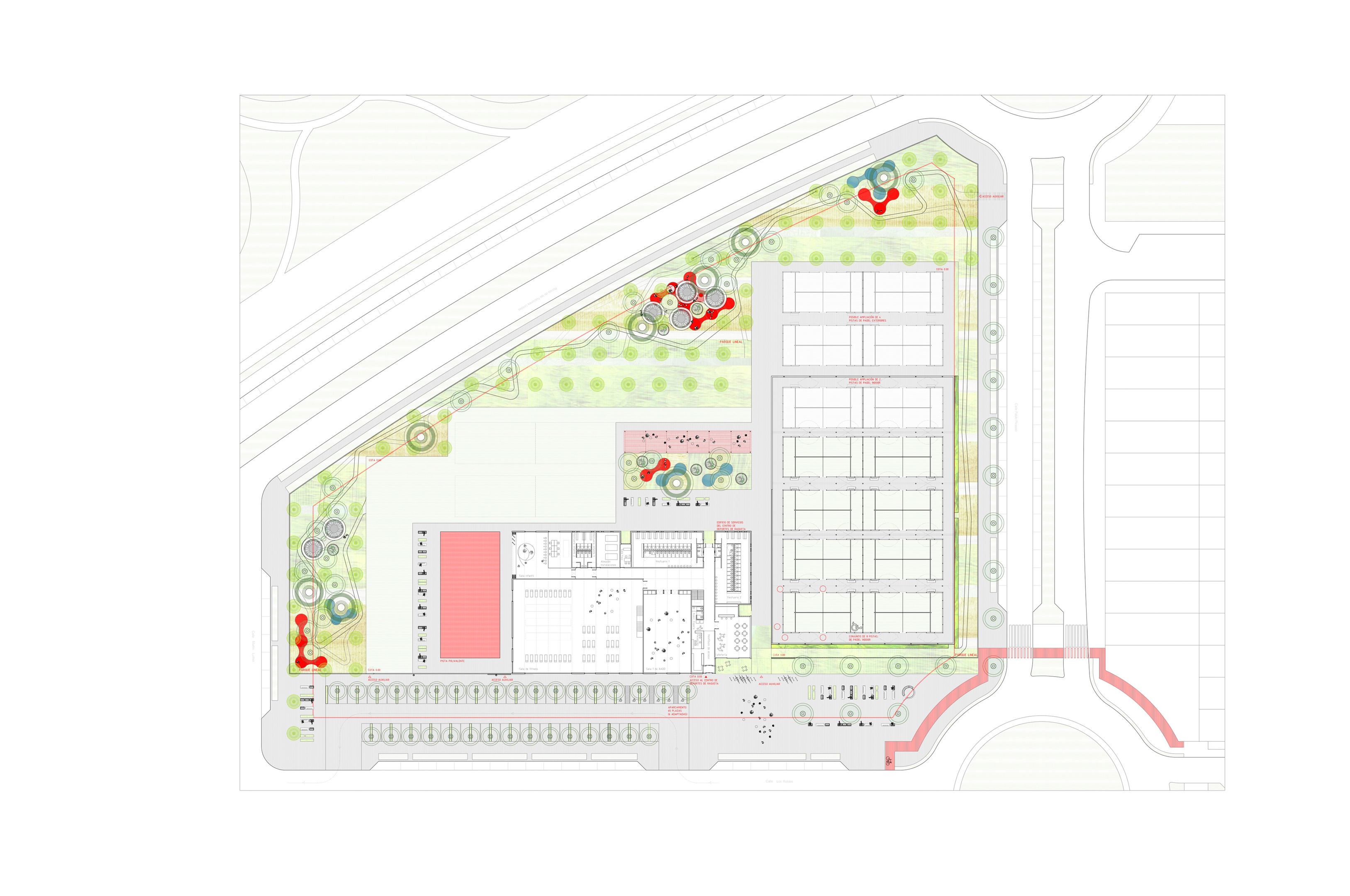 Proponemos articular los diferentes usos deportivos alrededor de un edificio de servicios cuyo espacio central será una gran sala Fitness desde donde exista una fácil conexión y visibilidad con todas las instalaciones deportivas y donde integrar usos como la cafetería, un área de juegos infantiles (con un fácil control parental), salas de actividades deportivas (spinning, body pump…) y diversas zonas verdes. El edificio, convenientemente modulado en elementos tridimensionales, será construido en taller (con estructura metálica, ligera, recuperable y con un grado de terminación del conjunto del 90%) y transportado en camiones hasta la parcela del Centro de Deportes, limitando los trabajos en el sitio a la cimentación, los remates y el montaje de la piel.