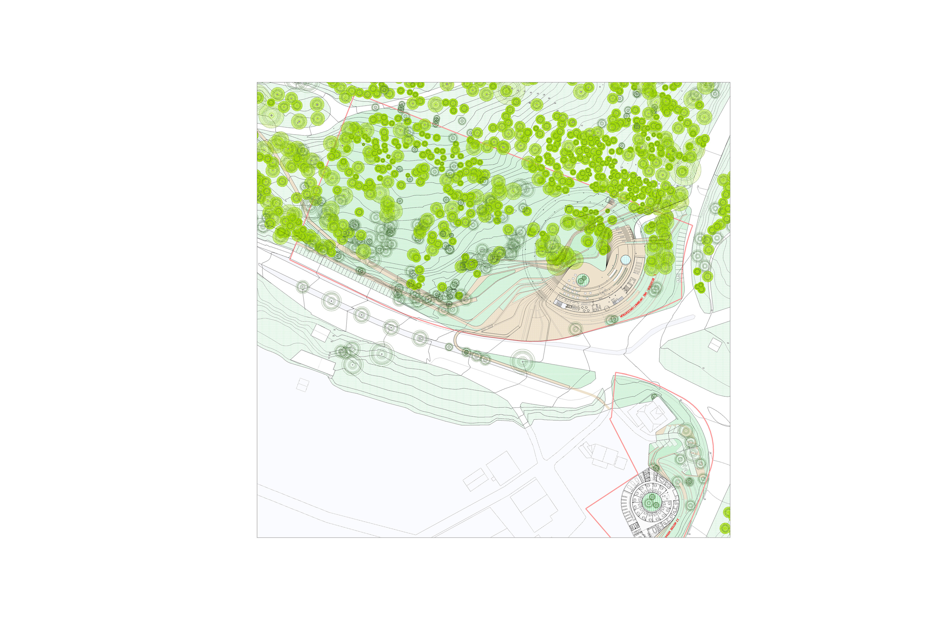 Abrazar un pedazo de selva negra. Planteamos acoger una de las áreas de arbolado de mayor valor, haciendo que forme parte del centro y, a su vez, se configure como un pequeño "laboratorio", cuyas condiciones de desarrollo natural puedan ser observadas y estudiadas, como "germen" de la regeneración del parque.